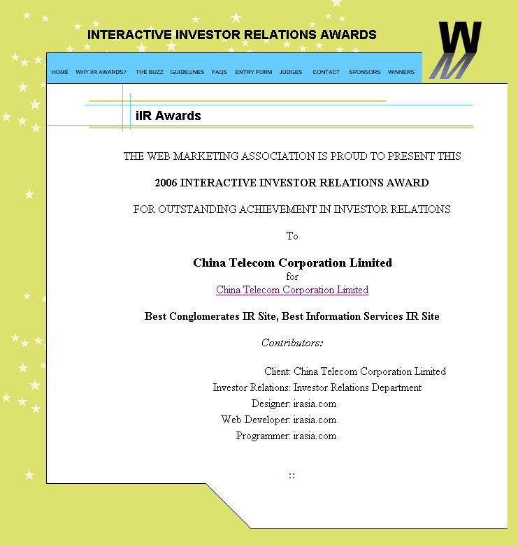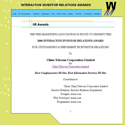 The corporate website of China Telecom Corporation Limited (www.chinatelecom-h.com) was honored with "Best Conglomerates IR Site" and "Best Information Services IR Site" in the 2007 Interactive Investor Relations Award, sponsored by renowned media The Wall Street Journal Online, American Stock Exchange and popular retail investment website TheStreet.com and etc.