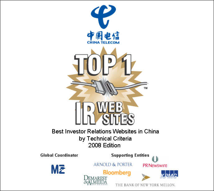 The corporate website of China Telecom Corporation Limited (www.chinatelecom-h.com) has been accredited as the "Best Investor Relations Website" in China in "IR Global Rankings 2008".