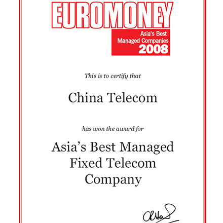 China Telecom Corporation Limited has been awarded "Asia's Best Managed Fixed Telecom Company" in the "Asia's Best Managed Companies 2008" ranking by Euromoney, an international reputable financial magazine.