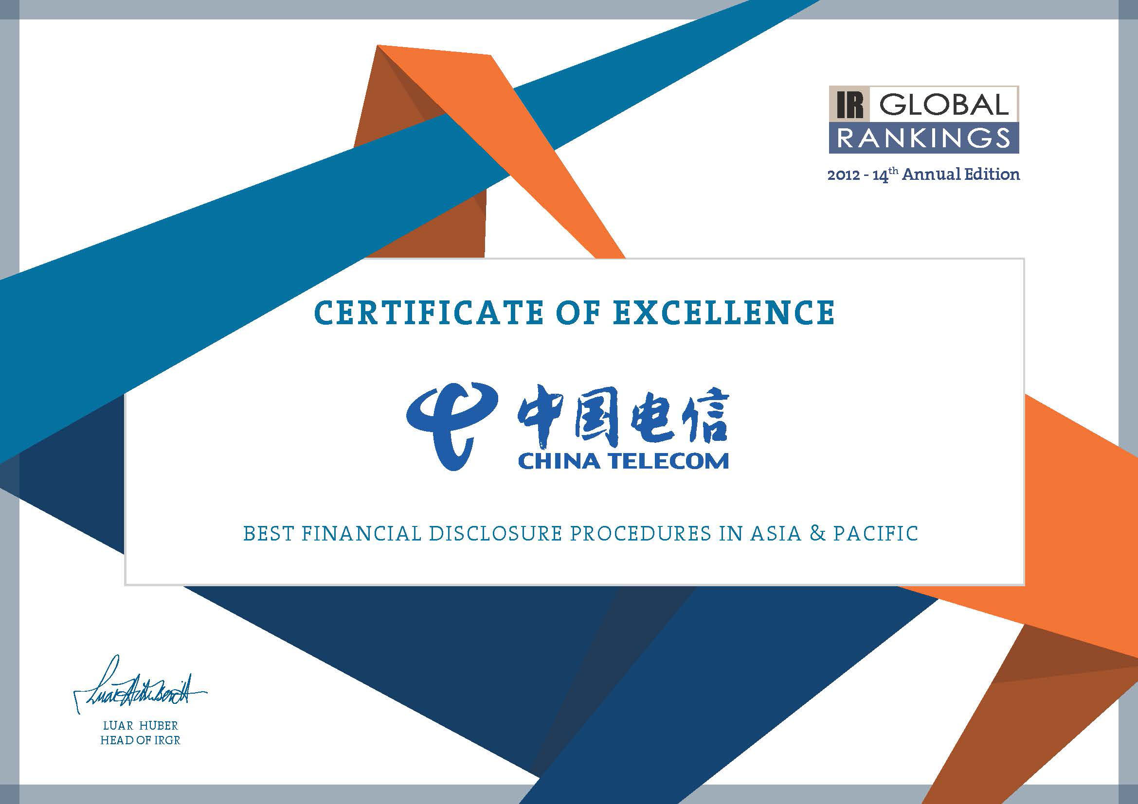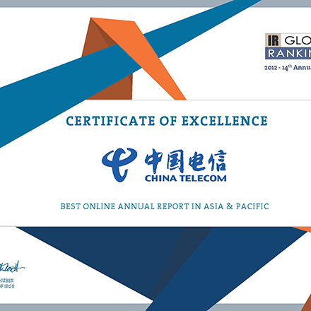 China Telecom Corporation Limited's website (www.chinatelecom-h.com) won the award of "No.1 Best Investor Relations Website in Asia & Pacific" in IR Global Rankings 2012. It is the second consecutive year the Company received this award. China Telecom was further honoured with "No.1 Best Financial Disclosure Procedures in Asia & Pacific" and "No.1 Best Online Annual Report in Asia & Pacific".