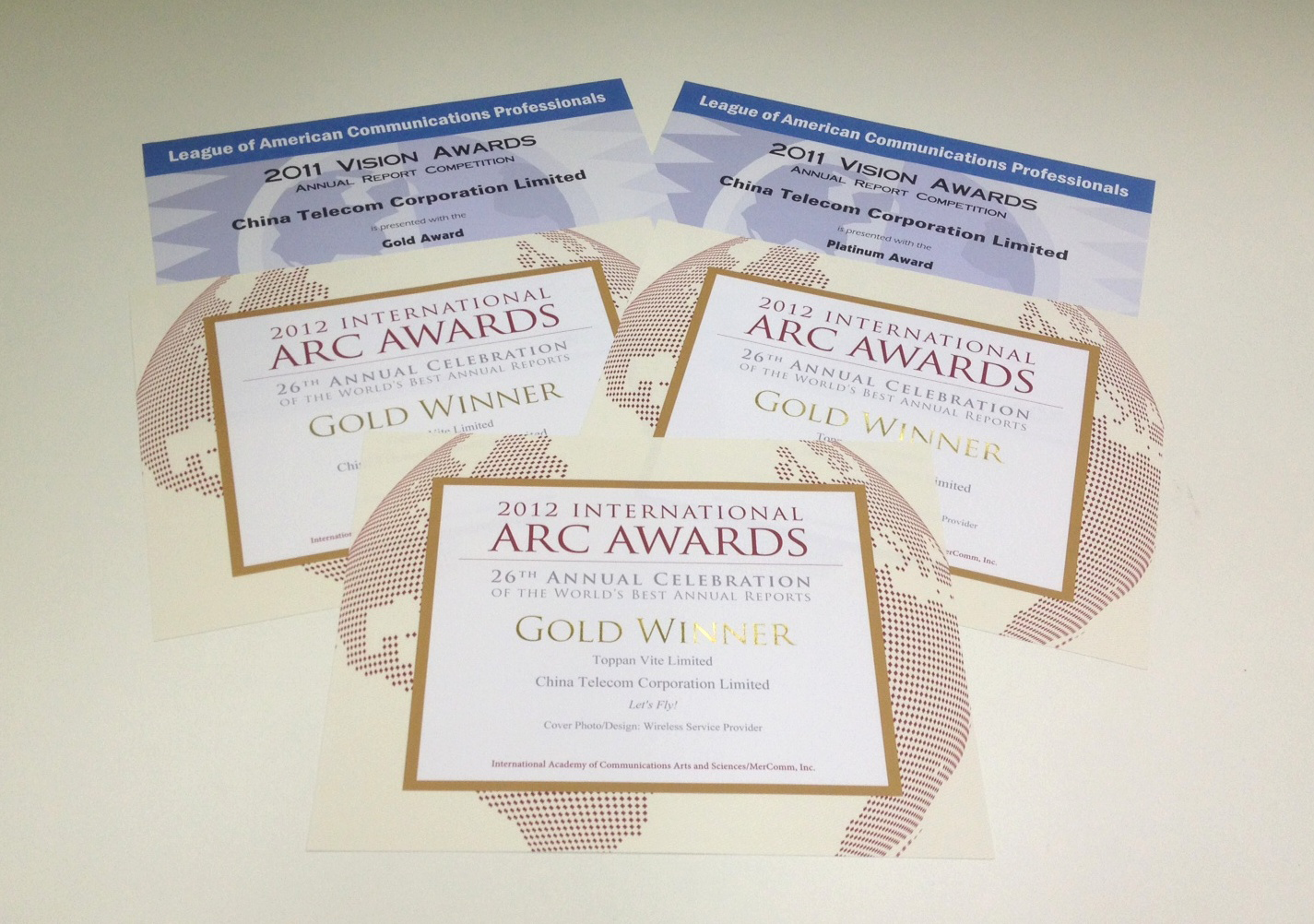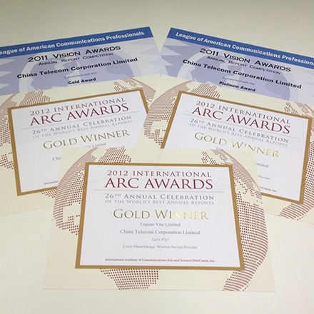 China Telecom Corporation Limited's 2011 Annual Report won a total of 5 gold awards in the 2012 International ARC Awards and Vision Awards Annual Report Competition by The League of American Communications Professionals LLC (LACP).