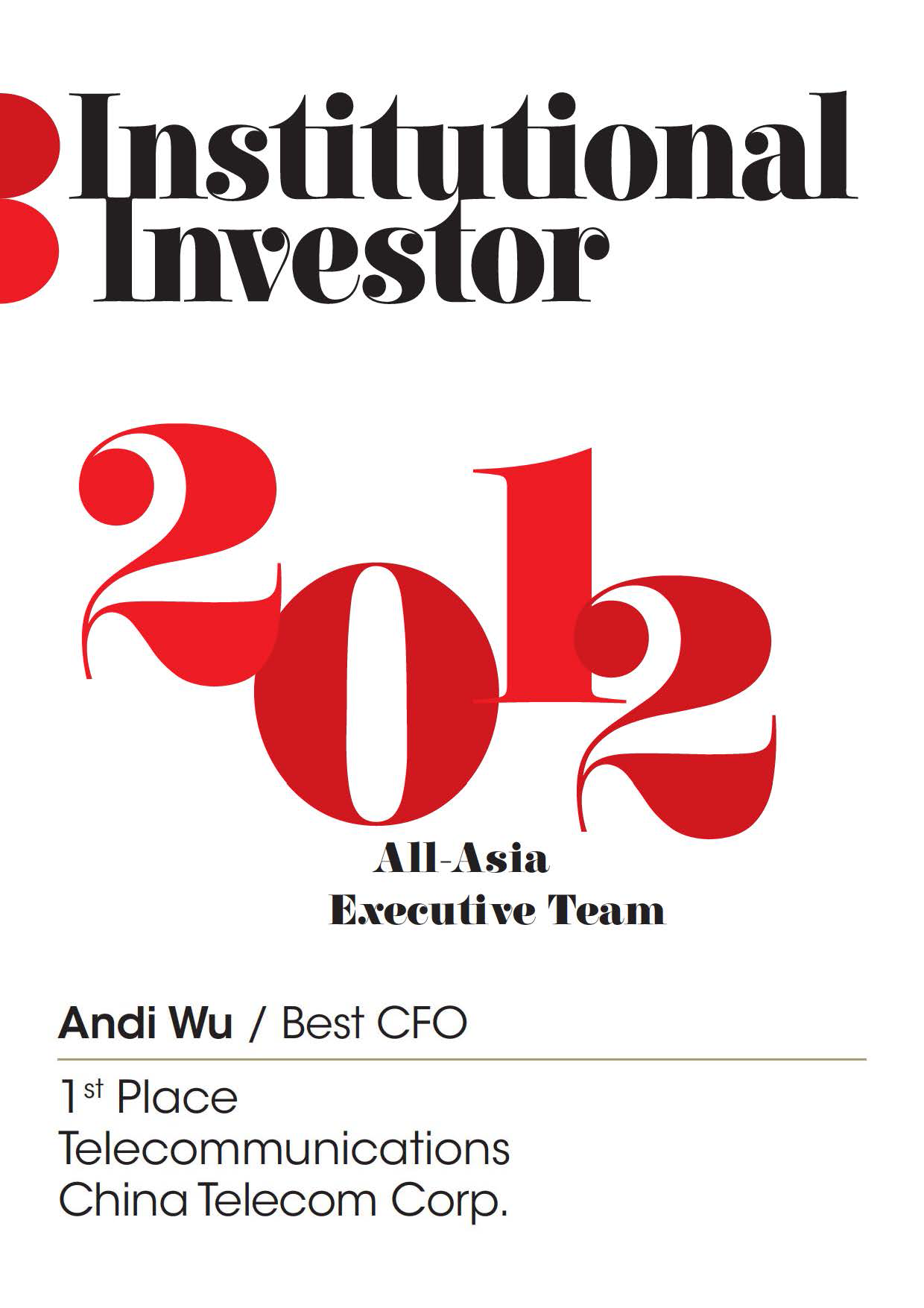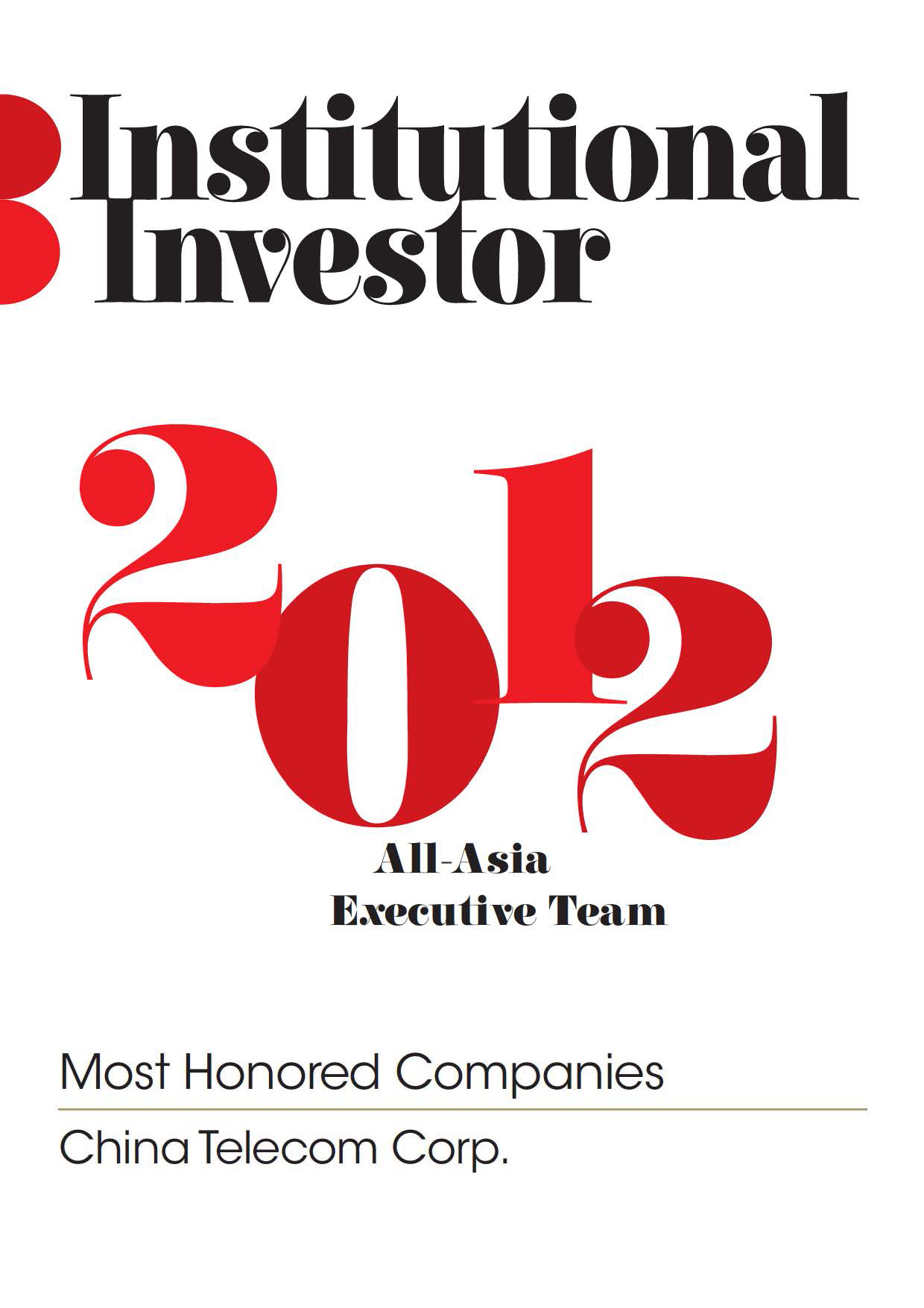 China Telecom Corporation Limited has been voted by professional investors again as one of the "Asia's Most Honored Companies" and "Asia's Best Investor Relations Company in telecommunications sector" in 2012 All-Asia-Executive-Team ranking organized by Institutional Investor, a highly-regarded international financial magazine. In addition, Mr. Wang Xiaochu, Chairman and CEO of China Telecom was voted "Asia's Best CEO in telecommunications sector" and Madam Wu Andi, Executive Vice President and CFO of the Company, was voted "Asia's Best CFO in telecommunications sector".