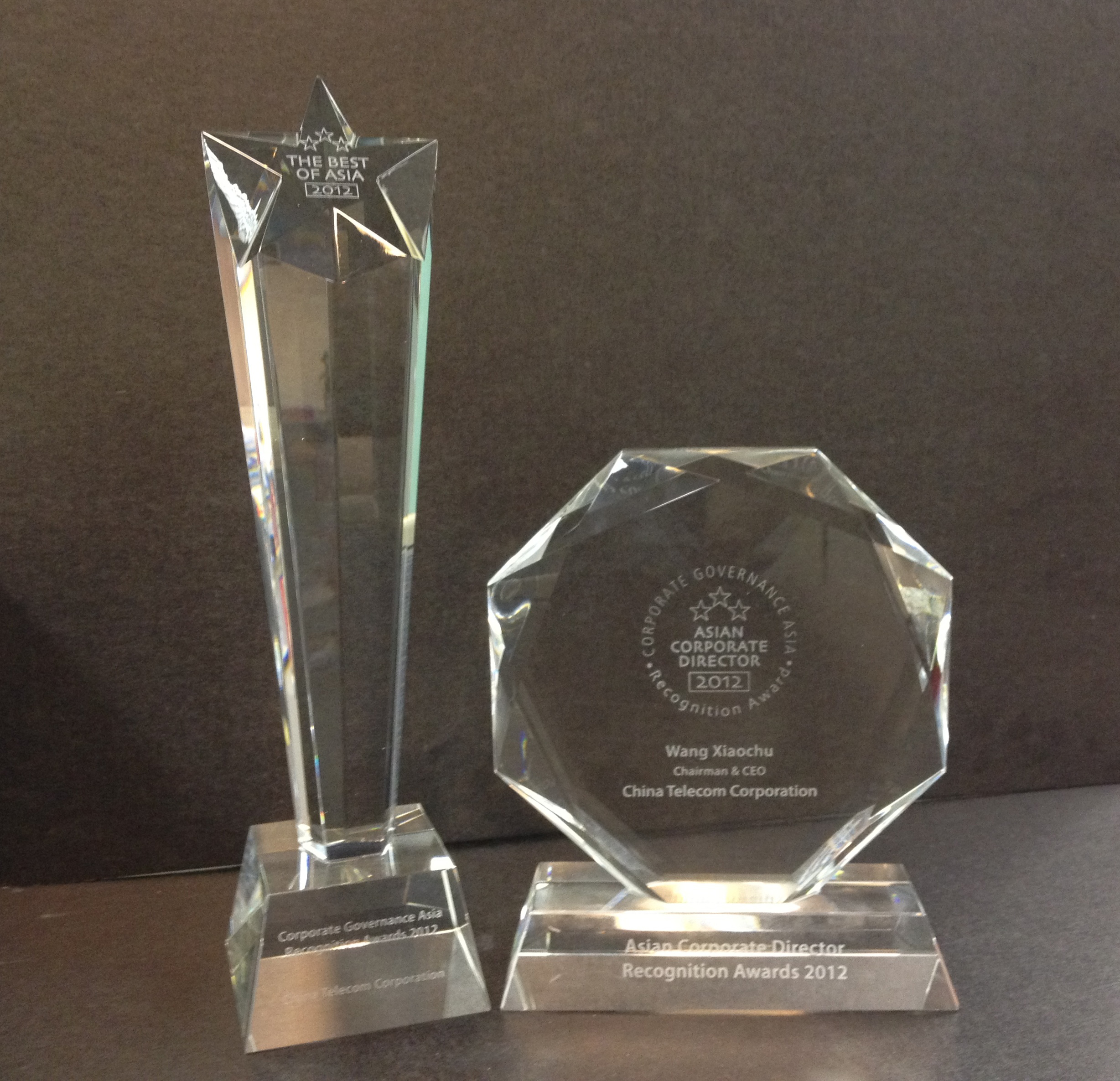 China Telecom Corporation Limited was awarded "The Best of Asia" in Corporate Governance Asia's 8th Recognition Awards 2012. This is the third consecutive year the Company received this award. In addition, Mr. Wang Xiaochu, Chairman & CEO, was honoured with "Asian Corporate Director Recognition Awards 2012".