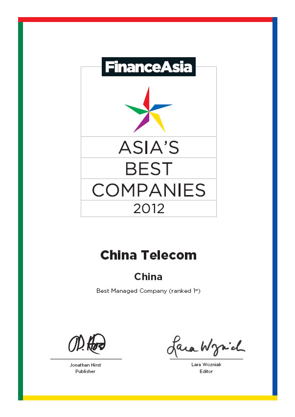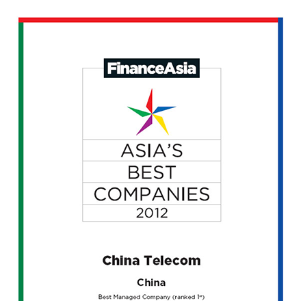 China Telecom Corporation Limited has been voted by investors for two consecutive years "Overall Best Managed Company in Asia" in Asia's Best Companies Poll 2012 by FinanceAsia, a leading and reputable financial magazine in Asia.