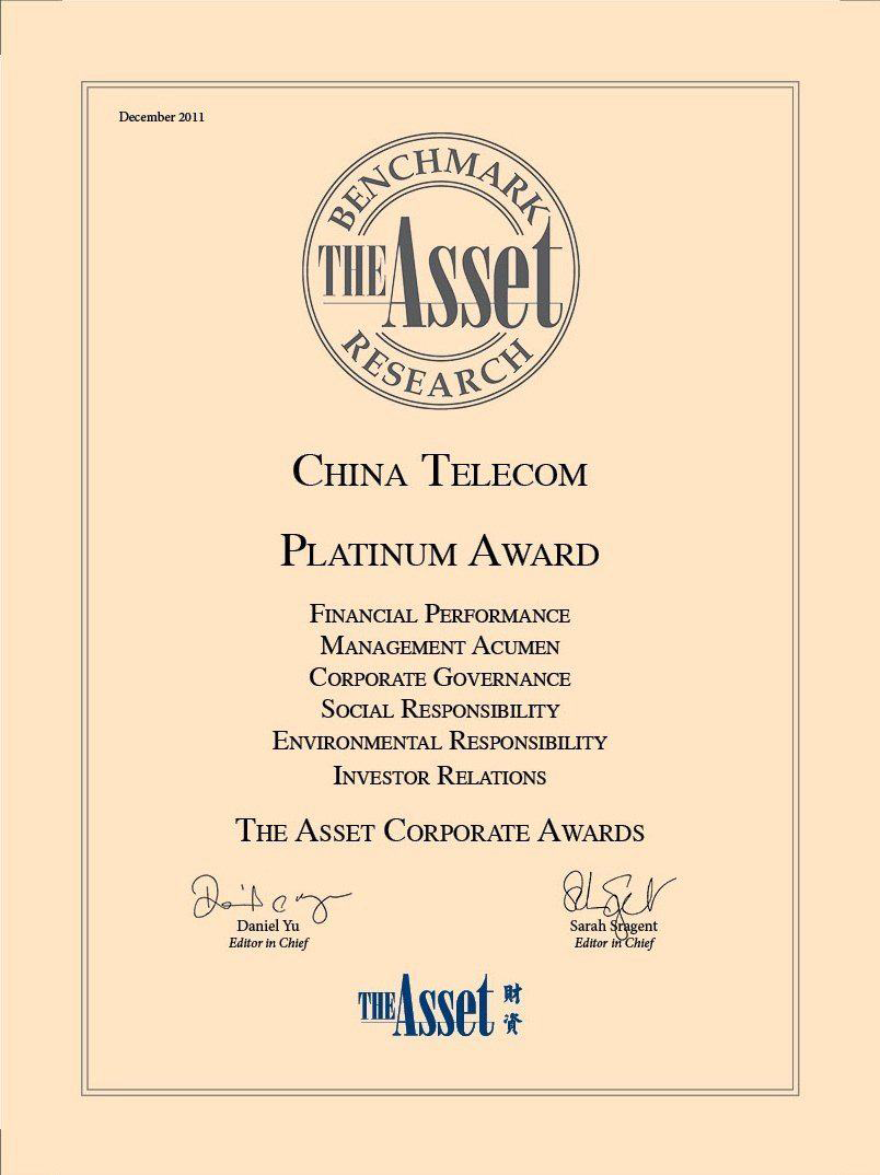 China Telecom was accredited with "Platinum Award for All-Round Excellence" in the poll of "Corporate Awards 2011" by The Asset, a reputable financial magazine in Asia. This is the third consecutive year the Company received this award. In addition, China Telecom was honoured with "China's Most Promising Companies 2011".