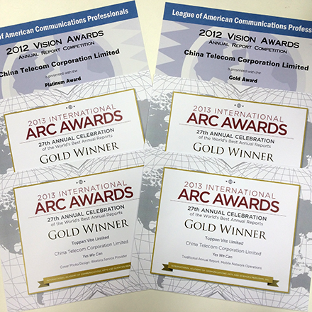 China Telecom Corporation Limited's 2012 Annual Report won gold awards in the 2013 International ARC Awards and Vision Awards Annual Report Competition by The League of American Communications Professionals LLC (LACP).