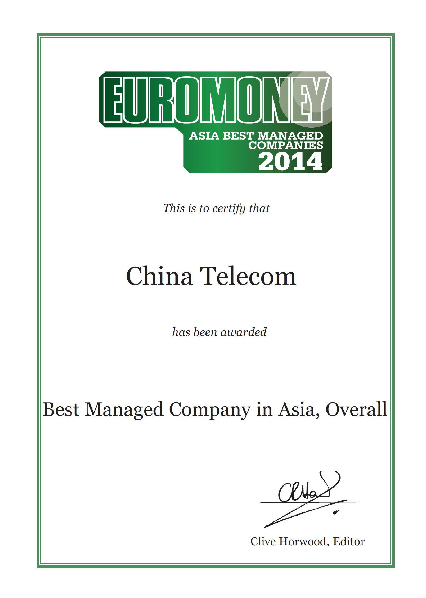 China Telecom Corporation Limited was voted by leading equity analysts "No.1 Best Managed Company in Asia", across all industries at the "Best Managed and Governed Companies - Asia Poll 2014" by Euromoney, a leading international financial magazine. In the individual categories, China Telecom was also ranked as "No.1 Most Convincing and Coherent Strategy in Asia", "No.1 Best Corporate Governance in Asia", "No.1 Most Accessible Senior Management in Asia", "No.1 Most Transparent Accounts in Asia", "No.1 Most useful and informative website in Asia", "No.1 Best Managed Company in Telecommunications Sector" and "No.1 Best Managed Company in Hong Kong".