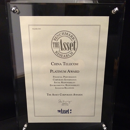 China Telecom Corporation Limited was accredited "Platinum Award for All-round Excellence" by "The Asset", a reputable financial magazine in Asia. The platinum awards recognised companies' attainment in all six categories of corporate endeavors: namely, corporate governance, business acumen, financial performance, social responsibility, environmental responsibility and investor relations, based on a ranking of listed companies in Asia by leading investment professionals and research analysts.