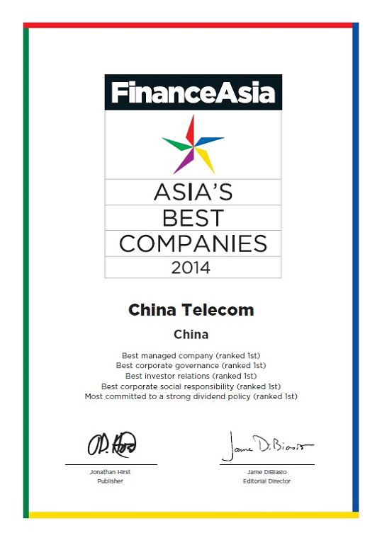 Euromoney's "Best Managed and Governed Companies - Asia poll 2014" is one of the most reputable polls in Asia. This is the 15th year of the event and is highly recognized by capital market participants. This year the Poll is based on a survey of 93 leading equity analysts at the largest investment banks and research institutes in Asia Pacific region who were asked to name which companies were the most impressive across a number of factors including management accessibility, accounting transparency and corporate governance procedures amongst others. Honoured with these highly regarded awards, it demonstrates that investment managers, analysts and capital market participants affirm China Telecom's excellent management performance and corporate governance with high recognition for the leading standard of its execution capability and transparency in Asia.