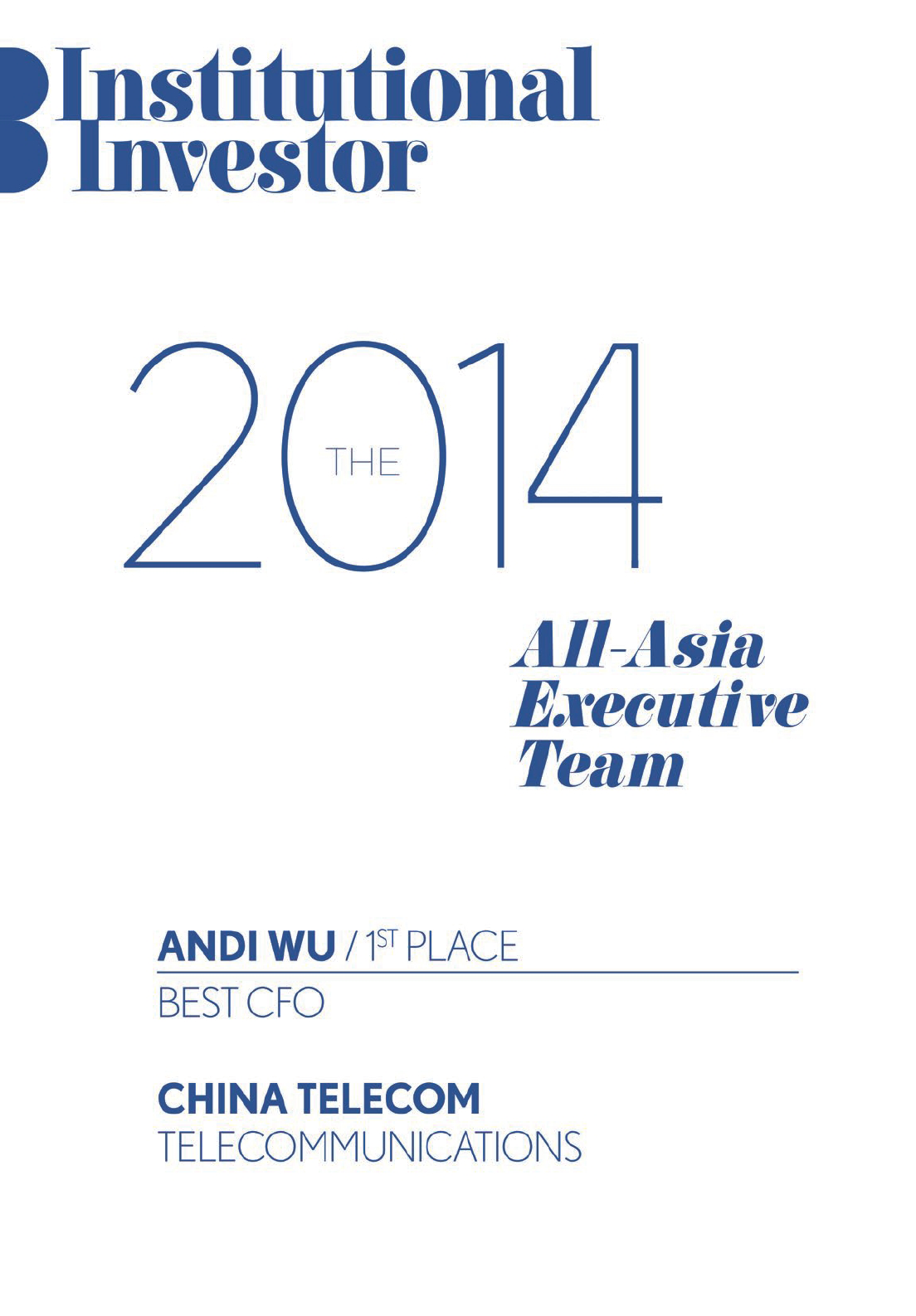 China Telecom Corporation Limited has been voted by professional investors "No.1 Most Honored Company in Asia" in << Institutional Investor >> 2014 All-Asia-Executive Team ranking. Mr. Wang Xiaochu, Chairman and CEO of China Telecom was voted again "Asia's Best CEO in telecommunications sector", while Madam Wu Andi, Executive Vice President and CFO of the Company, was voted "Asia's Best CFO in telecommunications sector". Besides, China Telecom was also ranked as "Asia's Best Investor Relations Company in telecommunications sector".
