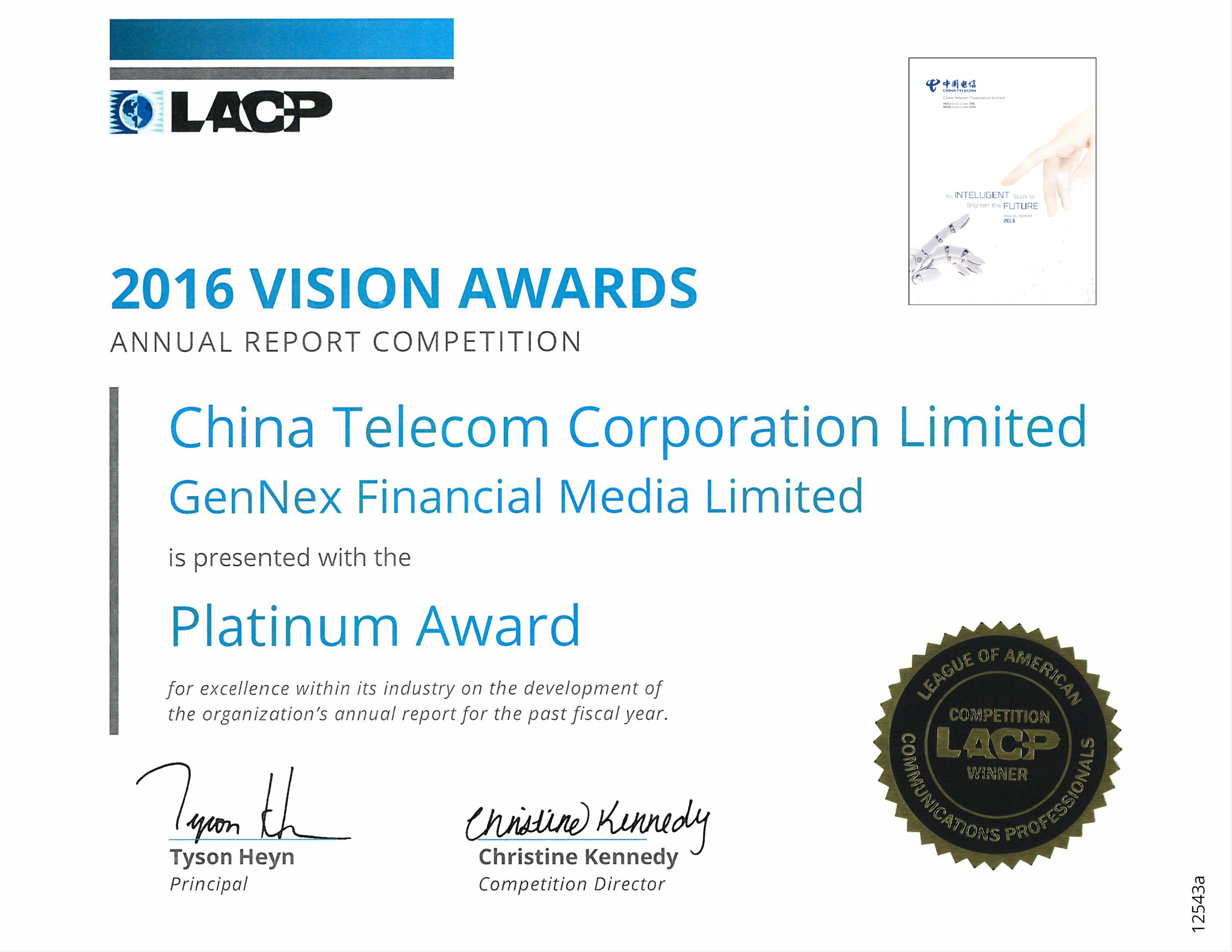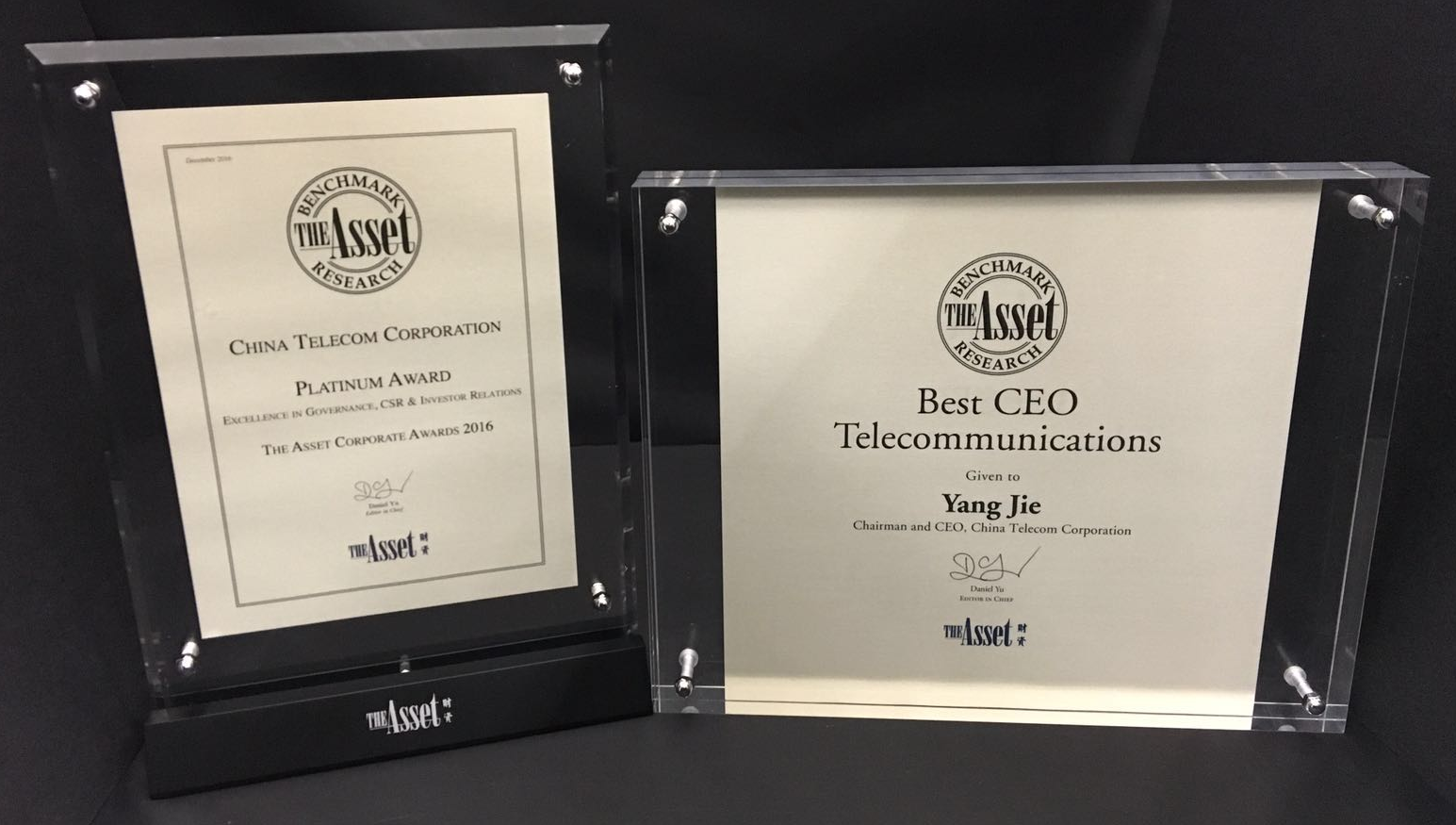 China Telecom Corporation Limited was accredited with "Platinum Award - Excellence in Governance, CSR & Investor Relations Benchmarking" in the poll of "Corporate Awards 2016" by The Asset. In addition, Mr. Yang Jie, Chairman and Chief Executive Officer of China Telecom, was honored with "Best CEO in Telecommunications" award.