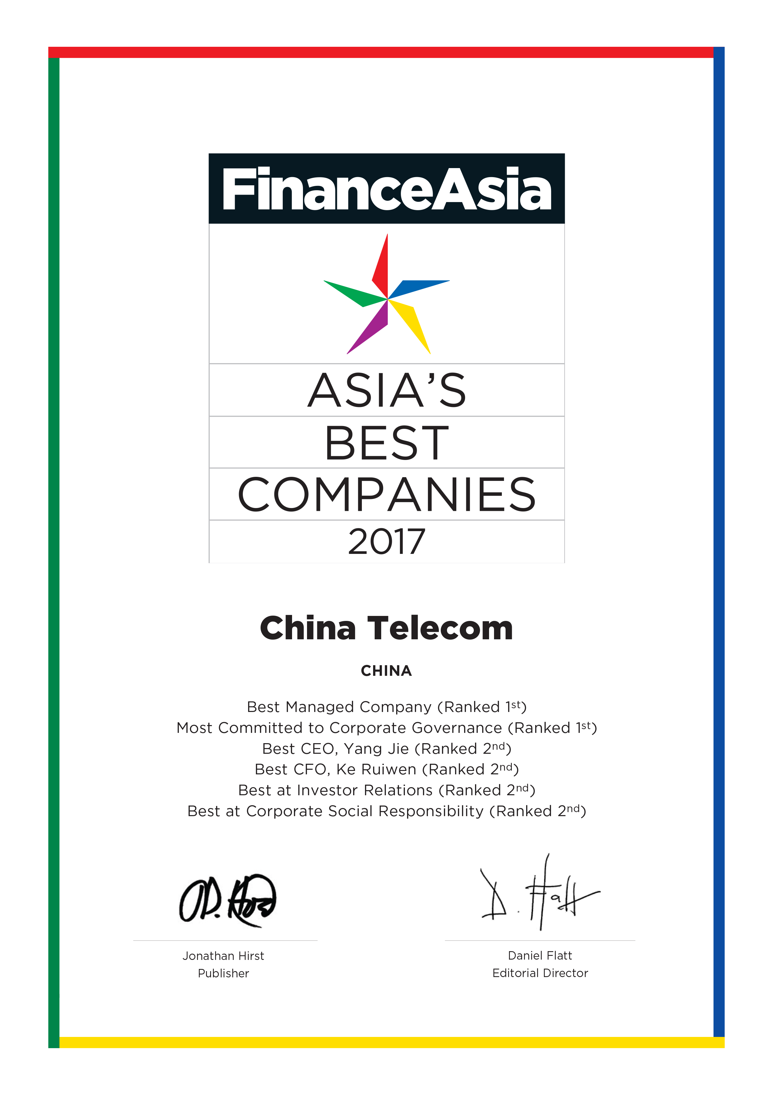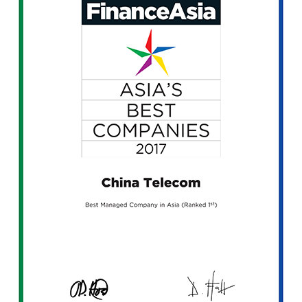 China Telecom Corporation Limited was voted by portfolio managers and analysts around the globe as "No. 1 Best Managed Company in Asia", at the "Asia's Best Managed Companies Poll 2017" by FinanceAsia, a reputable financial magazine in Asia.