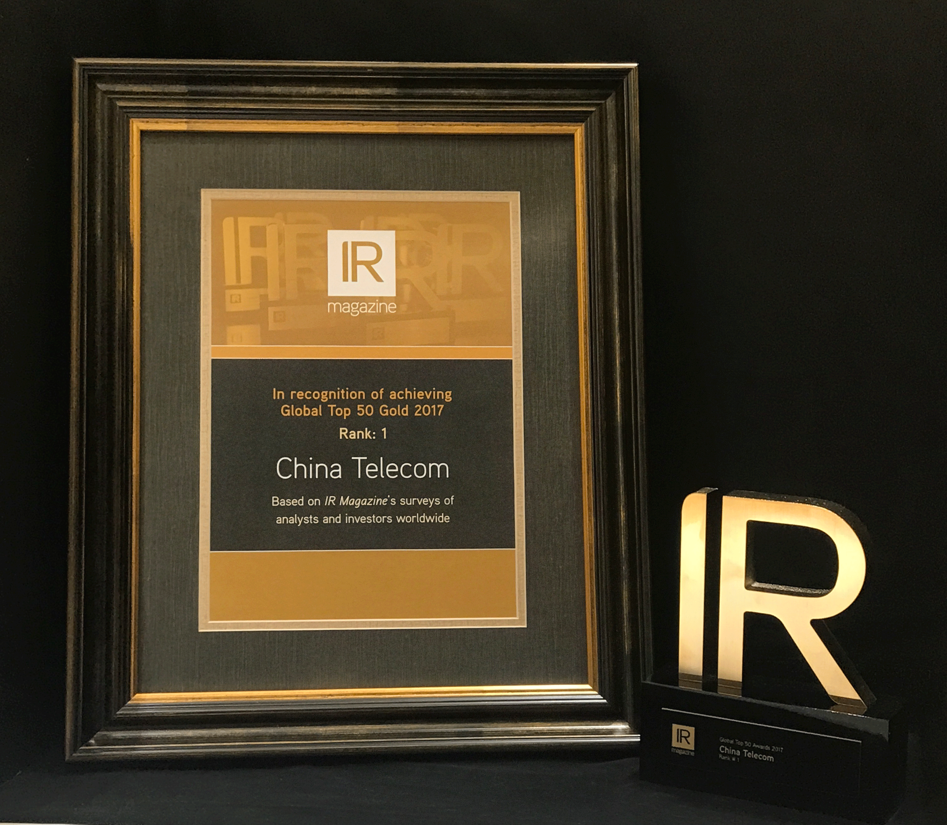 China Telecom Corporation Limited ("China Telecom" or "the Company"; HKEx: 00728; NYSE: CHA) ranks No. 1 in IR Magazine's "Global Top 50 Awards 2017". The Awards was based on IR Magazine's annual surveys of investors and analysts across the world for its regional awards programs in Europe, Brazil, Canada, US, Greater China and South East Asia. Last year, China Telecom ranked No. 2 in the "Global Top 50 Awards".