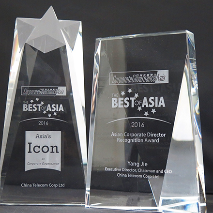 China Telecom Corporation Limited was awarded "The Best of Asia - Icon on Corporate Governance" in Corporate Governance Asia's Recognition Awards 2016. In addition, Mr. Yang Jie, Chairman & CEO, was honored with "Asian Corporate Director Recognition Award 2016".