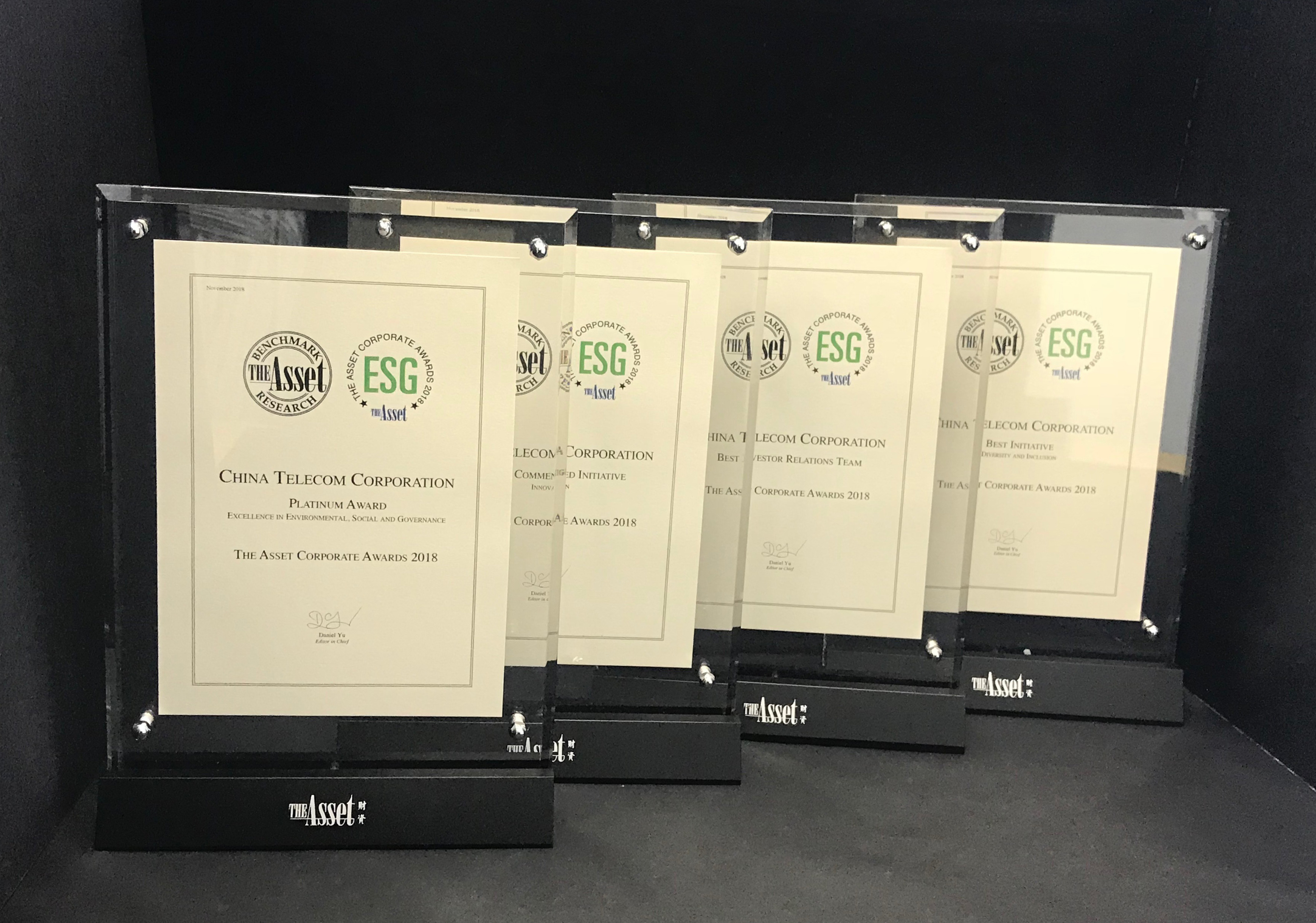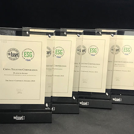 China Telecom Corporation Limited has won five awards in total by The Asset, achieving remarkable results. The Company was accredited with "Platinum Award - Excellence in Environmental, Social and Governance" in the poll of "Corporate Awards 2018" by The Asset. Only six companies have received the Platinum recognition for 10 consecutive years, of which China Telecom was the only telecommunications company that received such an honor. In addition, China Telecom and its Chairman and Chief Executive Officer, Mr. Yang Jie, were also honored with four other top awards.