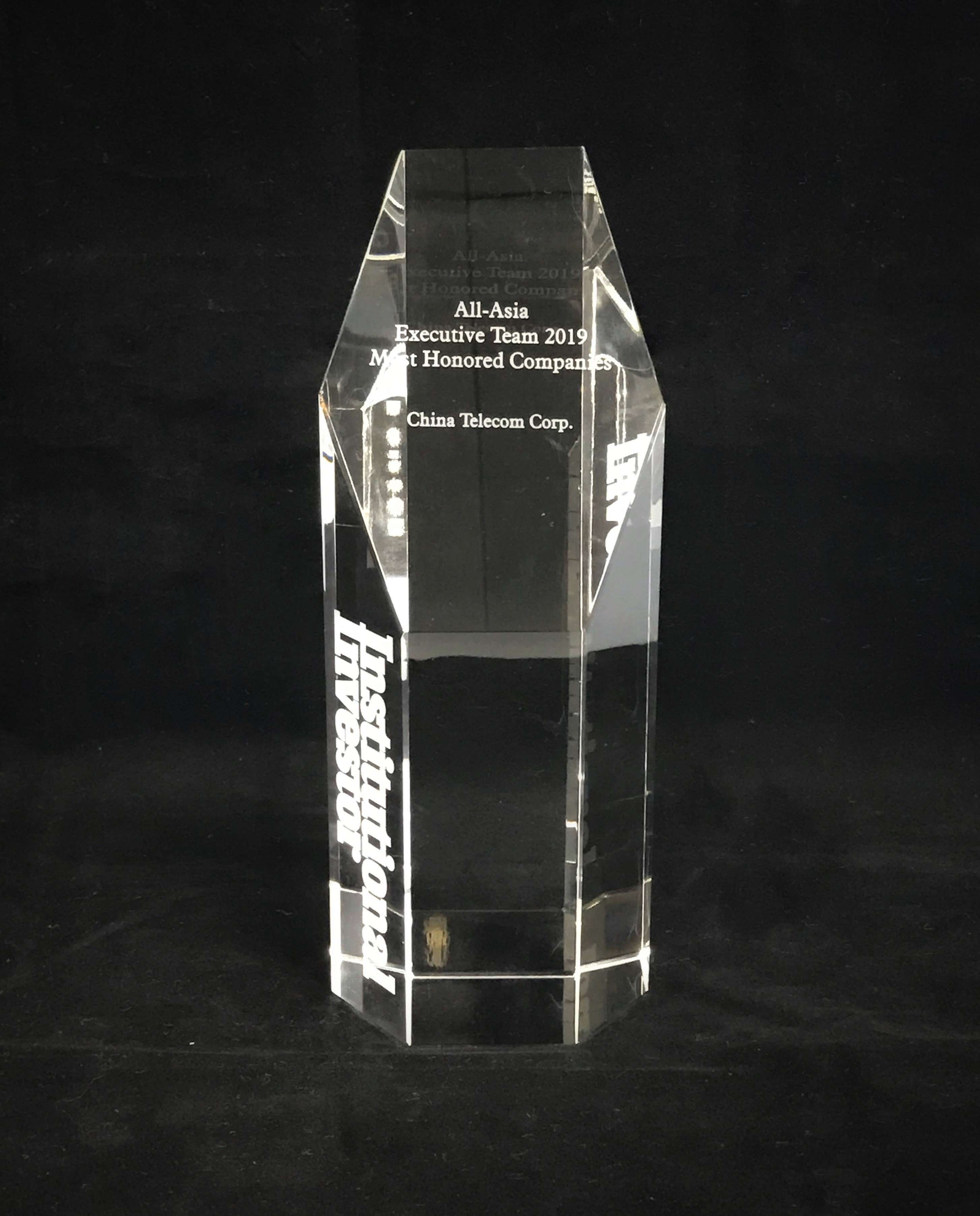 China Telecom Corporation Limited was voted as "Most Honored Companies in Asia" in the 2019 All-Asia-Executive Team Poll organized by Institutional Investor, a highly regarded financial magazine. The Company received this accolade every single year in the poll's nine-year history. The poll, organized to recognize top companies and executives in the region, received votes from over 1,800 buy-side investors and over 600 sell-side analysts. Moreover, China Telecom and its key executives also ranked 2nd place in multiple categories in the "Telecommunications" sector: