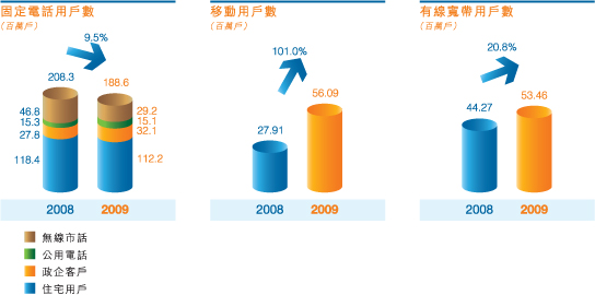 第四,加強渠道資源共享,全面提升渠道服務能力。全力推動社會渠道的建設,2009年底社會渠道網點較年初增長近4倍,積極與家電大賣場及手機專賣店等商家合作發展移動用戶,社會渠道發展新用戶的佔比逐月提升,截至2009年底已接近50%。我們還完善了電子渠道基礎服務,增強了自助服務能力,便於用戶通過手機、網絡辦理業務。此外,公司還擴大了首席客戶經理服務團隊和客戶服務規模,提升了重點業務的受理能力,有效落實了差異化服務。