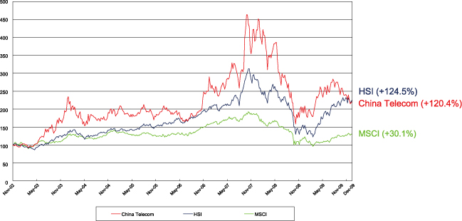 Share price performance of China Telecom on The Stock Exchange of Hong Kong Limited versus Hang Seng Index (HSI) and MSCI World Telecom Service Sector Index (MSCI) from IPO on 15 November 2002 to 31 December 2009.