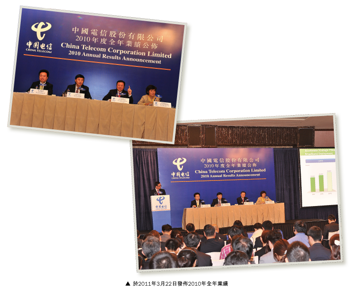 為加強與資本市場的溝通及提高信息披露的透明度,本公司按季披露收入、經營成本、EBITDA、淨利潤和其他若干主要經營指標,並按月公佈固定電話、移動用戶數及有線寬帶用戶數據。本公司高度重視與股東、投資者及分析師保持日常溝通,2010年參加了多家國際主要投資銀行舉辦的投資者大會,促進了與機構投資者的積極交流。