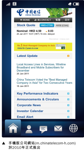 本公司的投資者關係網站(www.chinatelecom-h.com)不僅作為本公司向投資者及資本市場發放新聞和公司信息的重要渠道,還在本公司的估值和遵從信息披露法規要求等方面發揮了關鍵作用。2010年,為進一步提升本公司網站的信息披露及與投資者和股東溝通的互動性,本公司網站新增多項功能,包括互動股價信息圖、RSS、投資者公文包、社交網絡信息分享等。同時,利用嶄新科技「增強實境」技術,在本公司網站提供令人耳目一新的3D立體視覺體驗,展示年報重點信息。此外,本公司網站推出手機版,讓投資者和股東可隨時隨地通過移動裝置,便捷地瀏覽本公司網站內的重要信息。本公司網站在2010年國際《W3 Awards》評選中,獲得「最佳企業傳訊網站」金獎,顯示本公司網站獲得專業人士高度認同。本公司還主動向股東發放股東意見調查書,徵詢對年報改善的建議,並根據其建議積極以更環保和減省成本的方式編製及寄發年報。股東可選擇以電子方式收取公司年報和通訊,或只收取英文本、中文本或中英文本。