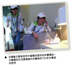 作為廣州2010年亞運會的綜合信息服務高級合作伙伴,中國電信以完備的通信網絡保障、先進的綜合信息應用以及優質的通信信息服務,全業務、全天候、全方位地助力「數字亞運」。中國電信將自身的網絡優勢與服務亞運相結合,將自身的業務創新與惠及民生相協調,將自身的戰略轉型、發展與社會責任的履行相一致,在確保亞運通信安全暢通,以綜合信息服務引爆亞運精彩的同時,使企業的持續發展與國家發展、民生改善更加緊密地聯繫在一起。