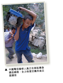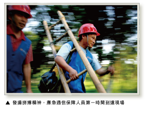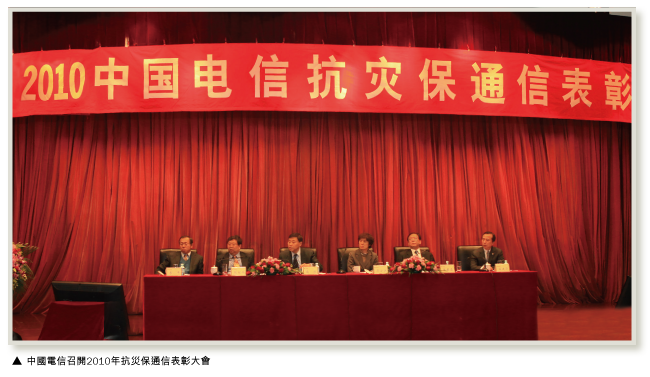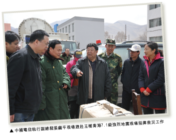 2010年4月14日玉樹發生7.1級強烈地震,震後10分鐘,中國電信立刻啟動全網應急預案,迅速派出第一支搶修隊伍趕赴災區,隨後又派出多支搶險小組奔赴一線,在餘震頻繁、天氣惡劣的情況下,員工冒着生命危險,克服種種困難,取得了一個又一個的「第一」,完成了作為國家主體信息運營企業的重托和使命。