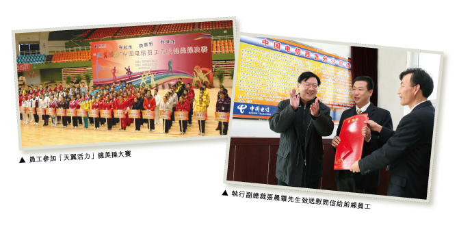 中國電信注重員工工作生活平衡,倡導開展融思想性、知識性、趣味性於一體,喜聞樂見、參與面廣的業餘文體活動,引導員工健康的精神文化消費,緩解工作壓力,培養健康的生活休閒方式,進一步增強企業的向心力和凝聚力。