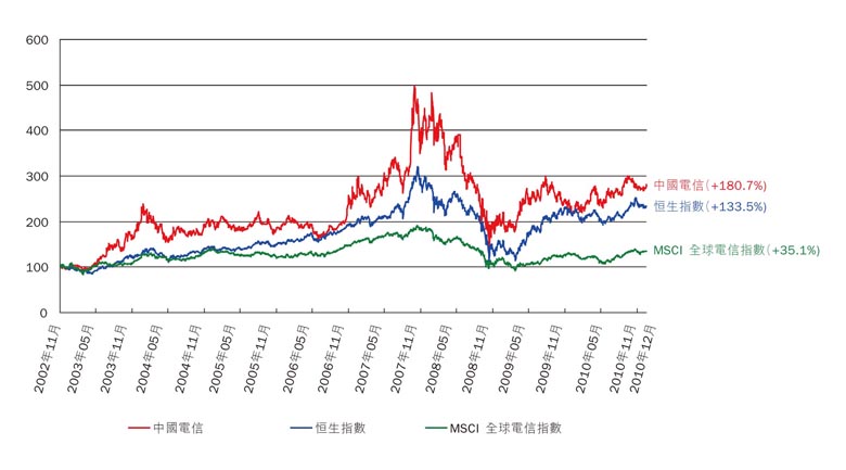於2002年11月15日股份初次發行至2010年12月31日期間,中國電信於香港聯合交易所有限公司上市的股價表現與恒生指數及MSCI全球電信指數比較。