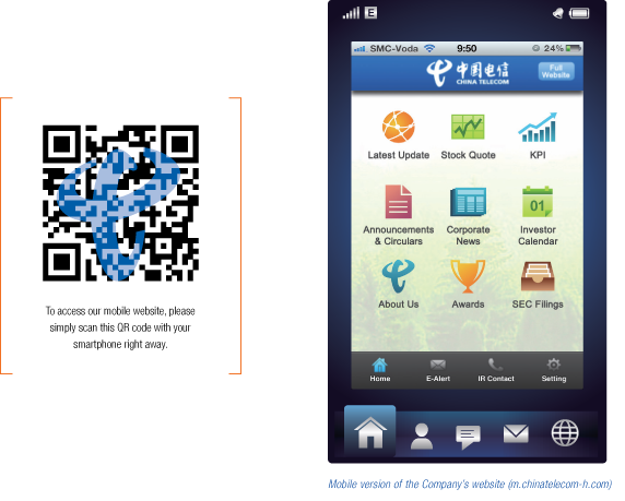 The Company’s investor relations website (www.chinatelecom-h.com) not only acts as an important channel for the Company to disseminate press releases and corporate information to investors and the capital market, but also plays a significant role in the Company’s valuation and our compliance with regulatory requirements for information disclosure. In 2011, a number of new functions and contents were added to the corporate website to further enhance the information disclosure of the Company’s website to meet the international best practices, including monthly net add of 3G subscribers and quarterly key operational and financial interactive charts. In addition, a mobile version of the Company’s website was also launched, which allows the investors, shareholders, media and the general public to easily browse the updated information on the Company’s website through mobile devices at any time and any place. The Company’s website not only won the Gold Award for investor relations website in China, but also the Gold Award in Asia Pacific in IR Global Rankings 2011, indicating that the Company’s website is highly recognised by professionals. The Company also took the initiative to actively seek recommendations on how to improve the Company’s annual report from shareholders through survey, and in accordance with its shareholders’ recommendations prepared and distributed the annual report in a more environmentally friendly and cost-saving manner. The shareholders can ascertain their choice of receiving the annual reports and communications by electronic means, or receiving English version only, Chinese version only or both English and Chinese versions.