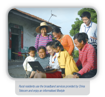 It is a shared responsibility of all telecommunications operators to bridge the digital divide between cities and the countryside and to guarantee the rights to fundamental telecommunications for all citizens. China Telecom continued the implementation of the “Village-to-Village” projects to speed up the construction of service outlets in rural areas and raise the standard of informatisation for township governments, agricultural enterprises and individual farmers. In 2011, the installation of broadband lines in 10,500 administrative villages was completed.