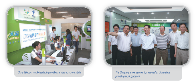 As the only full services global communication partner of the 2011 Universiade in Shenzhen, China Telecom organised a thousand technicians to build and open for traffic “three major systems” for event scoring, event management and event command, and “four specialised networks” namely the competition, event management, security transmission, and radio and television signal transmission networks, as well as IT facilities in 56 venues, to ensure uninterrupted communication services. Our work received high recognition from the Organising Committee, athletes, media and other parties. We were awarded the honours of “Advanced Unit” and “Innovative Business Award” by the Universiade for communications support and service.