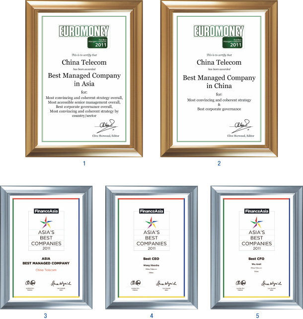 | 4 | Mr. Wang Xiaochu, Chairman and CEO was awarded the “Best CEO in China” by FinanceAsia in the Asia’s Best Companies Poll 2011. |