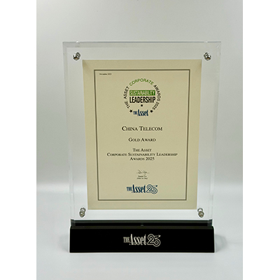 由亚太区知名财经杂志《财资》(The Asset)举办的“2025年度企业可持续发展领导力大奖”结果公布,中国电信股份有限公司凭借领先的理念、体系化的管理和优秀的可持续发展成果,荣获“企业大奖”金奖,并摘得“最佳投资者关系团队”、“最佳环境责任举措”与“最佳科技创新举措”荣誉。