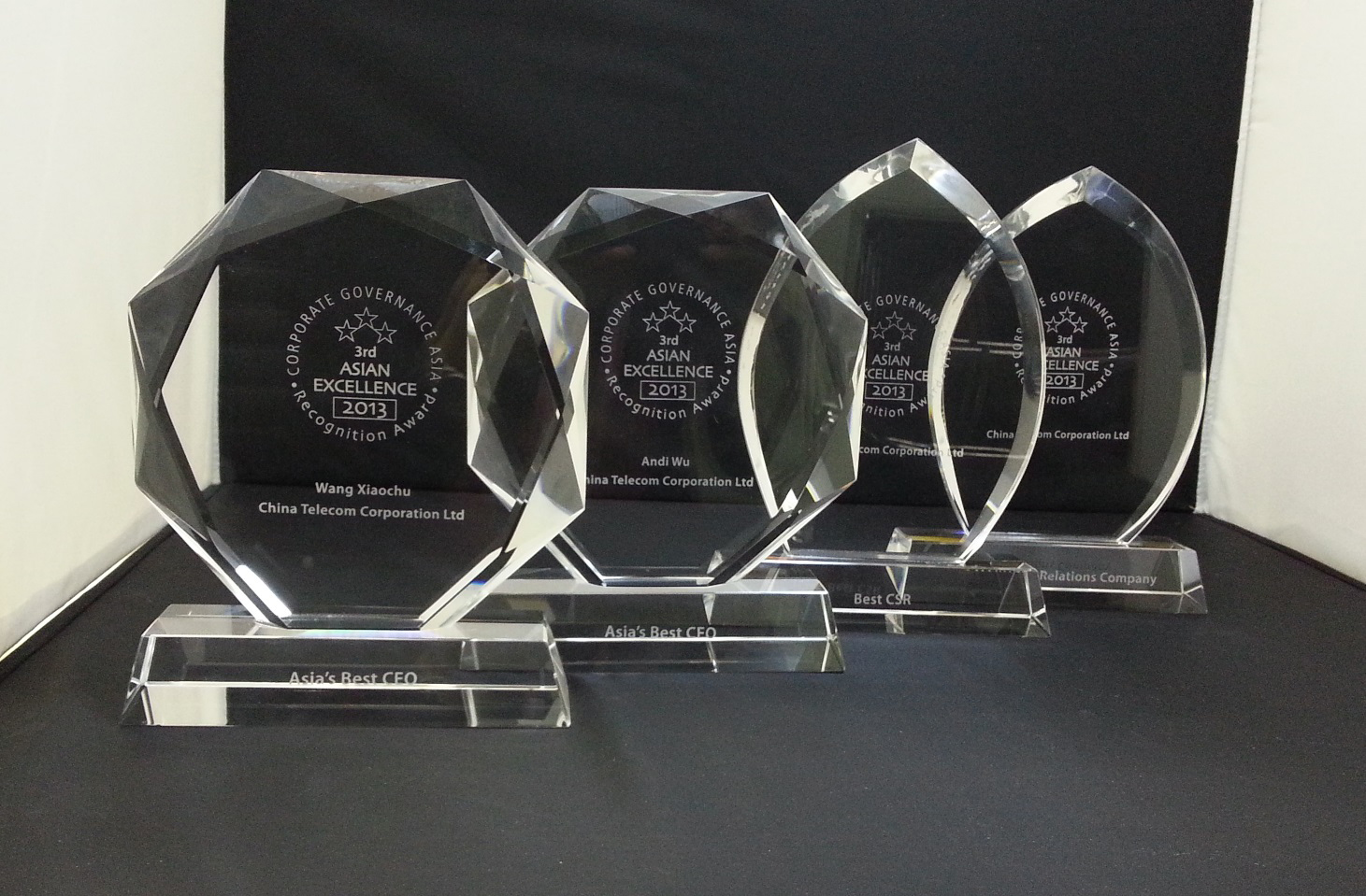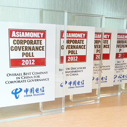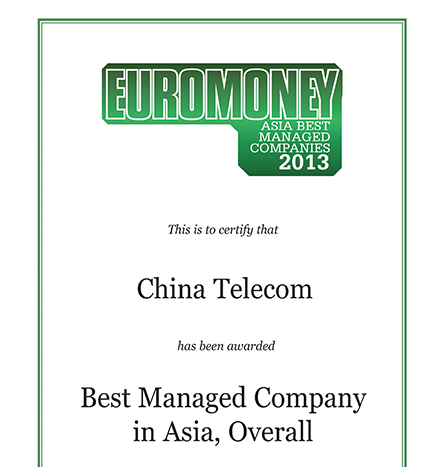 中国电信股份有限公司在亚洲权威财经杂志《亚洲货币》(Asiamoney) 举办的2012年「企业管治评选」中,获投资者评选为「中国全方位最佳企业管治公司第一名」。
