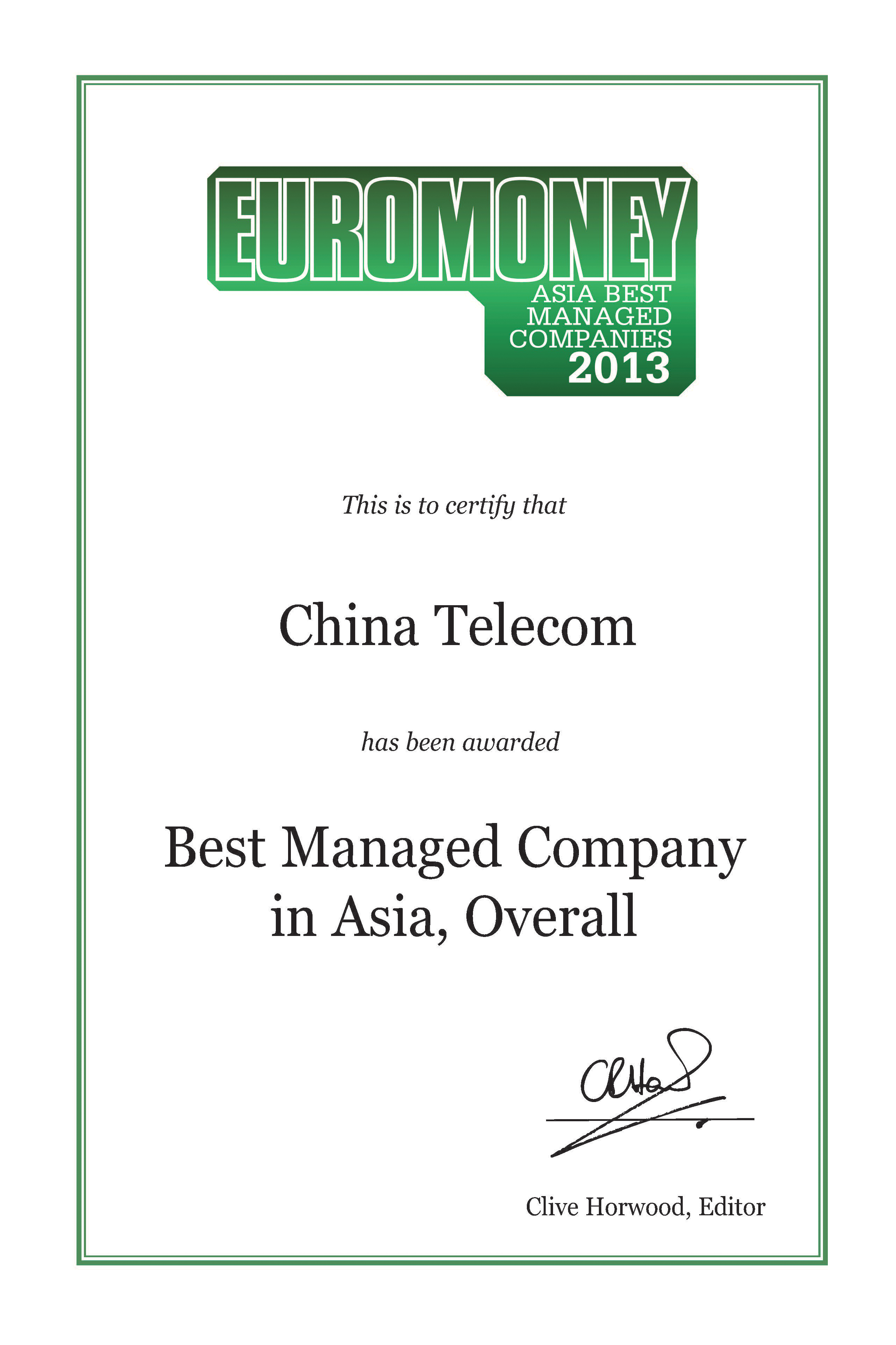 中国电信股份有限公司在国际权威财经杂志《Euromoney》最新年度亚洲最佳管理公司评选中,连续四年获投资分析师从多个行业中投票评选为「亚洲最佳管理公司第一名」,成为首家公司连续四年获得这项荣誉。同时,中国电信亦在单项评选中获得「亚洲最令人信服企业战略第一名」、「亚洲最佳企业管治第一名」、「亚洲最佳股东价值创造第一名」及「亚洲最佳财务披露第一名」。