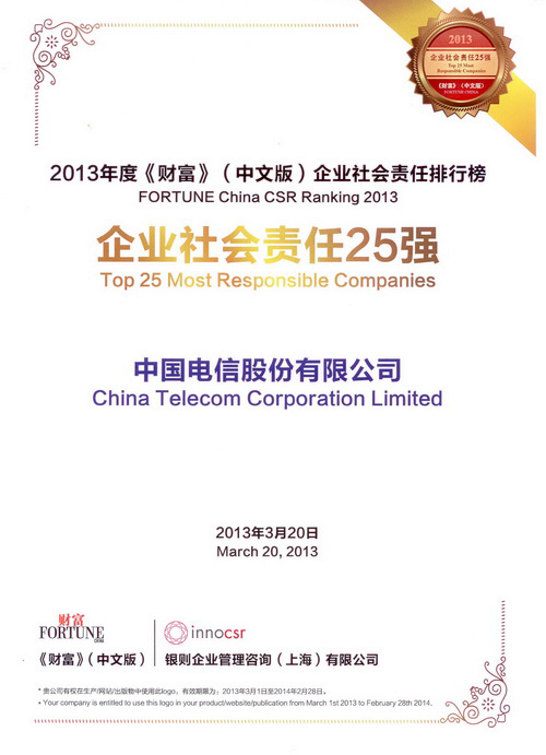 中国电信于《财富》(中文版)杂志2013年度《财富中国企业社会责任排行榜》中跃升至第14位,首次入选"中国企业25强"。
