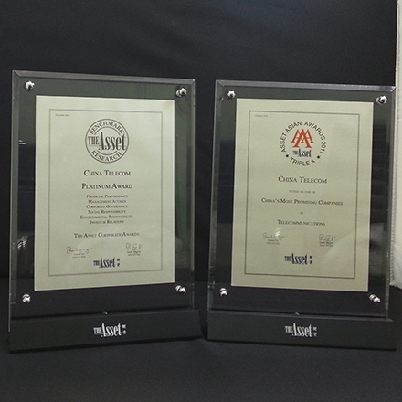 中国电信股份有限公司获得亚洲著名财经杂志《The Asset》颁发「全方位杰出企业白金奖」及「最具潜力中国企业」两项大奖。企业白金奖项主要根据投资分析师的专业意见评定,表扬公司在企业管治、管理层素质、财务表现、社会责任、环境保护和投资者关系等全部六个范畴的出色表现。