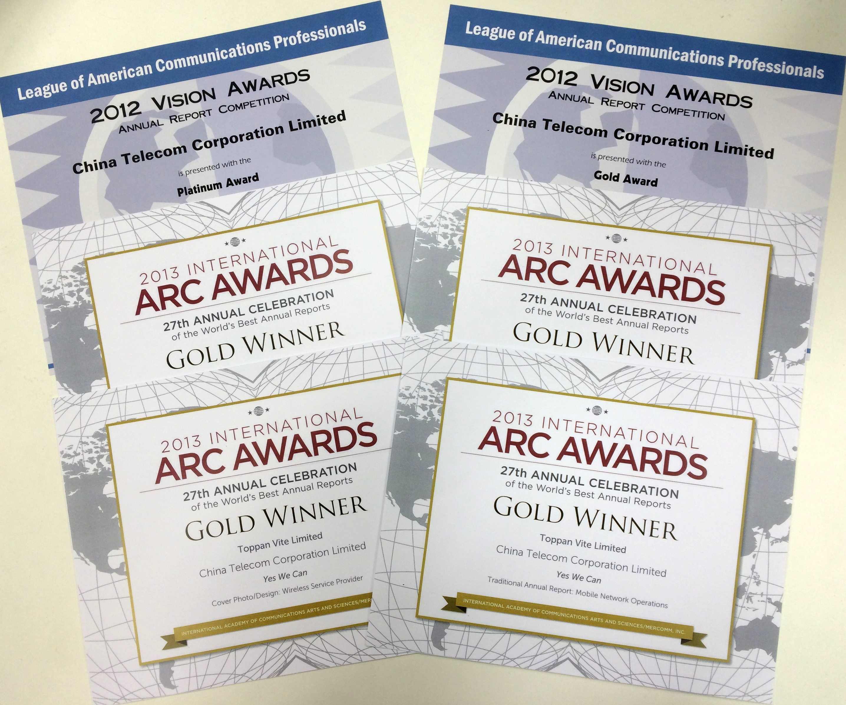 中国电信股份有限公司的2012年年报在国际权威年报评选《2013年度国际ARC大奖》及《美国传媒专业联盟》(LACP)举办的《Vision Awards》年报比赛中,荣获多项金奖。