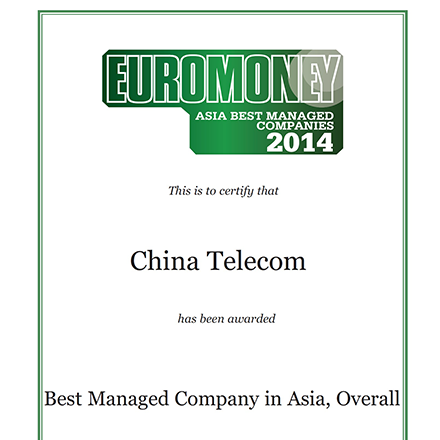 中国电信股份有限公司在国际权威财经杂志《Euromoney》最新年度亚洲最佳管理公司评选中,连续五年获投资分析师从多个行业中投票评选为「亚洲最佳管理公司第一名」。同时,中国电信亦在单项评选中获得「亚洲最令人信服企业战略第一名」、「亚洲最佳企业管治第一名」、「亚洲最乐于与资本市场沟通管理层第一名」、「亚洲最佳财务披露第一名」、「亚洲最具实用及资讯性网站第一名」、「电信业最佳管理公司第一名」及「香港最佳管理公司第一名」。