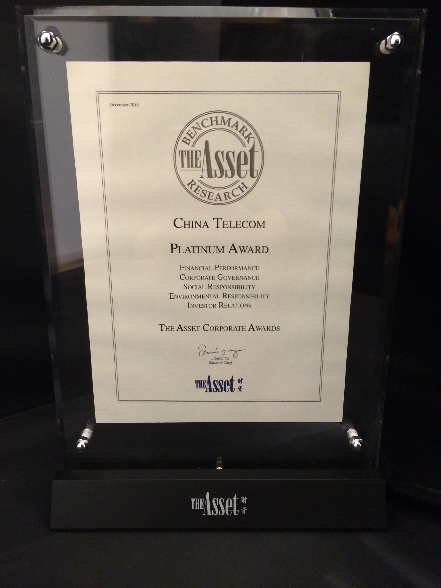 中国电信股份有限公司获得亚洲著名财经杂志《The Asset》颁发「全方位杰出企业白金奖」。企业白金奖项主要根据投资分析师的专业意见评定,表扬公司在企业管治、管理层素质、财务表现、社会责任、环境保护和投资者关系等全部六个范畴的出色表现。