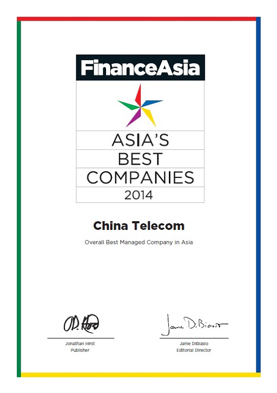 中国电信股份有限公司在《金融亚洲》(FinanceAsia)举办的第十四届年度亚洲最佳公司评选中,连续四年获机构投资者及分析师评选为「亚洲全方位最佳管理公司」。