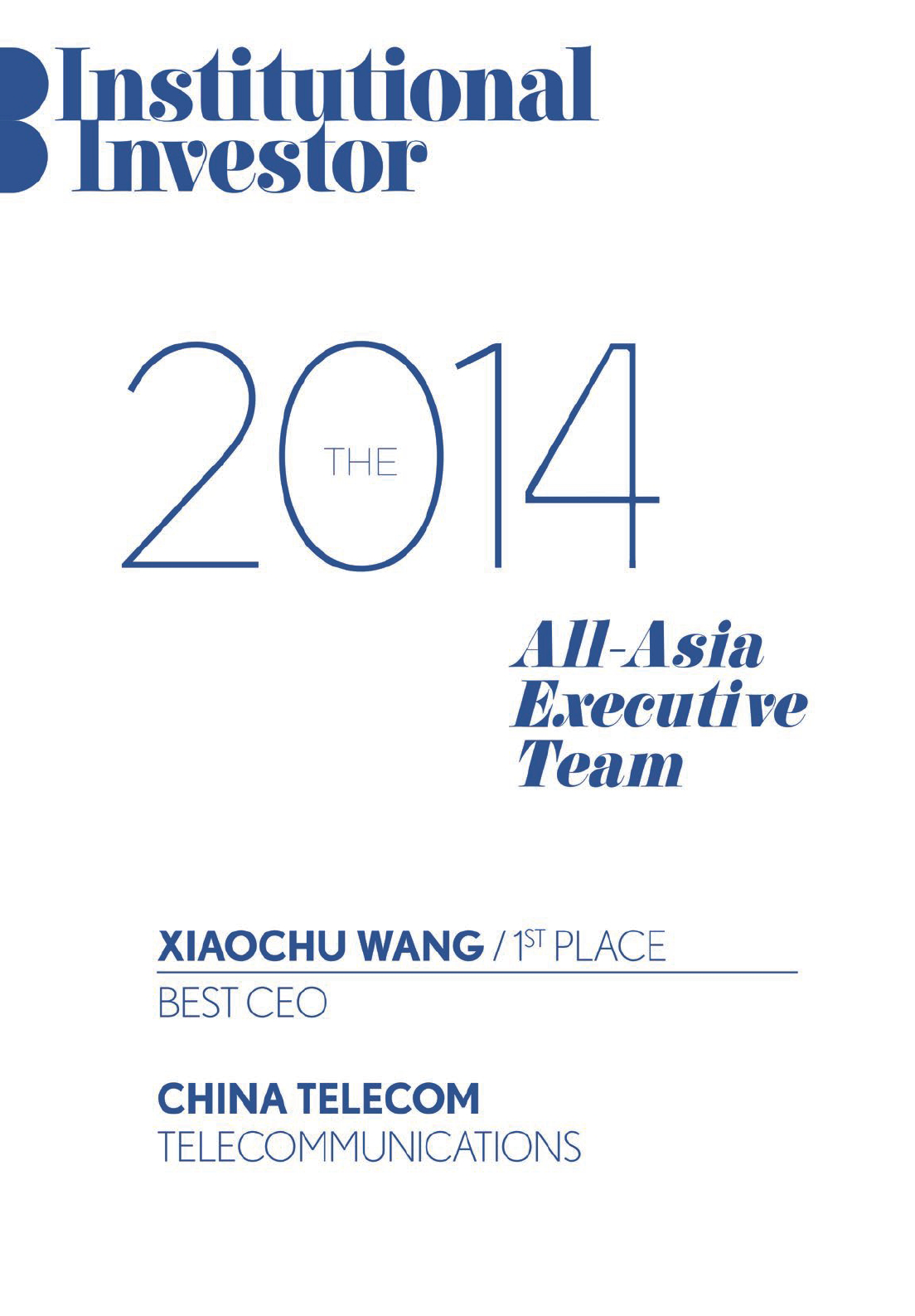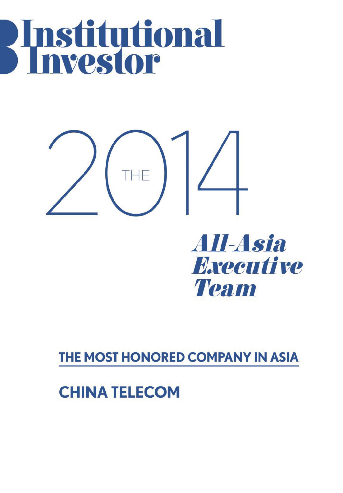 中国电信股份有限公司在《机构投资者》(Institutional Investor)举办的2014年度「亚洲最佳企业管理团队」评选中获专业投资者评选为「亚洲最受尊崇企业第一名」。公司董事长兼首席执行官王晓初先生再度获评选为「亚洲电信业最佳首席执行官」;公司执行副总裁兼财务总监吴安迪女士获评选为「亚洲电信业最佳财务总监」。同时,公司获评选为「亚洲电信业最佳投资者关系公司」。