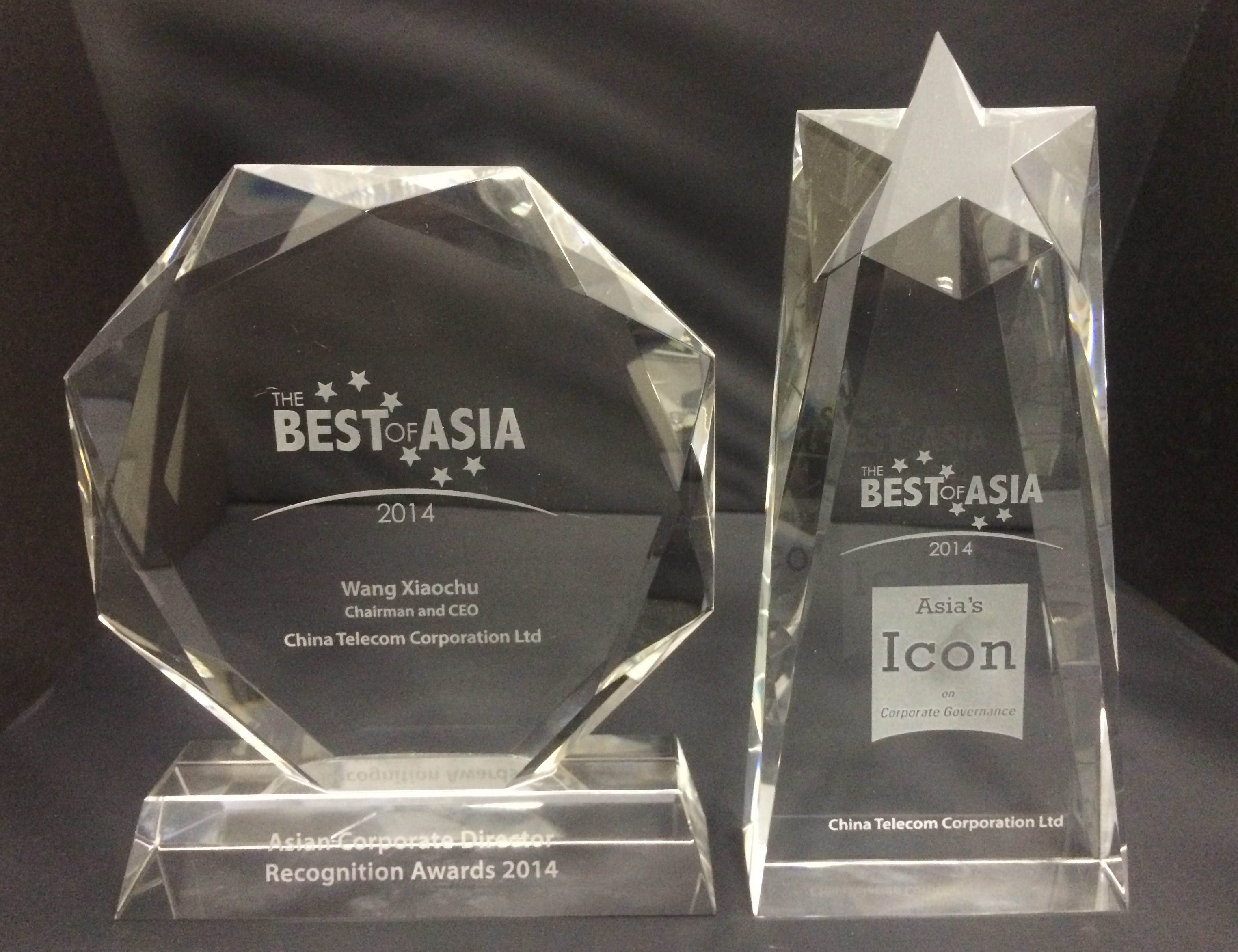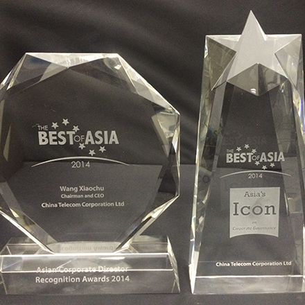 中国电信股份有限公司在《Corporate Governance Asia》杂志2014年亚洲最佳企业管治评选中,获评选为「亚洲最佳公司 - 企业管治典范」。此外,董事长兼首席执行官王晓初先生获颁发「2014年亚洲区最佳公司董事」奖项。