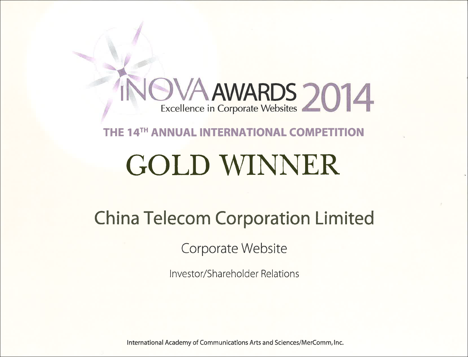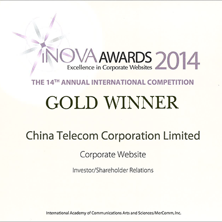 中国电信股份有限公司网站 (www.chinatelecom-h.com) 在2014年获《iNova Awards》颁发「投资者关系网站」金奖。