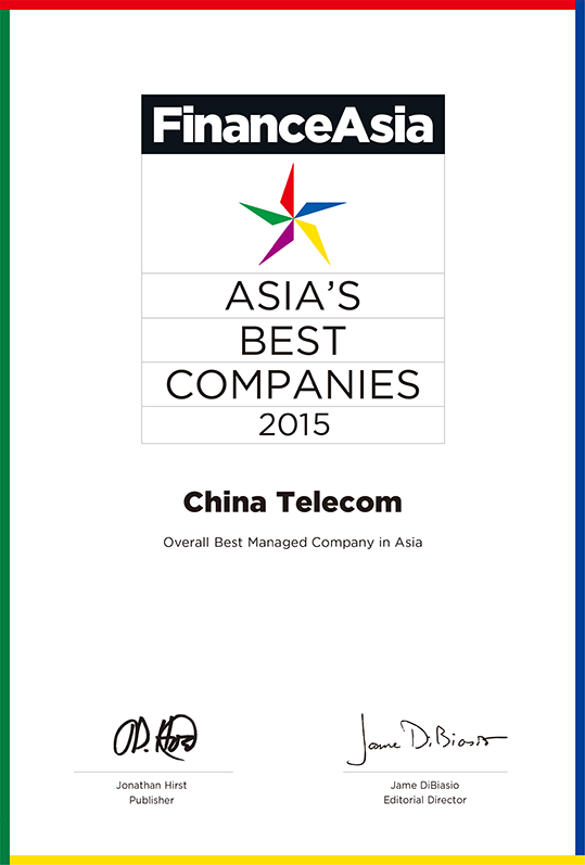 中国电信股份有限公司在《Euromoney》2015年度最佳管理公司评选中,连续六年获来自全球不同地区领先的投资银行及金融机构的投资分析师投票评选为「亚洲最佳管理公司第一名」。同时,中国电信在评选中亦荣获「亚洲电信业最佳管理公司第一名」。
