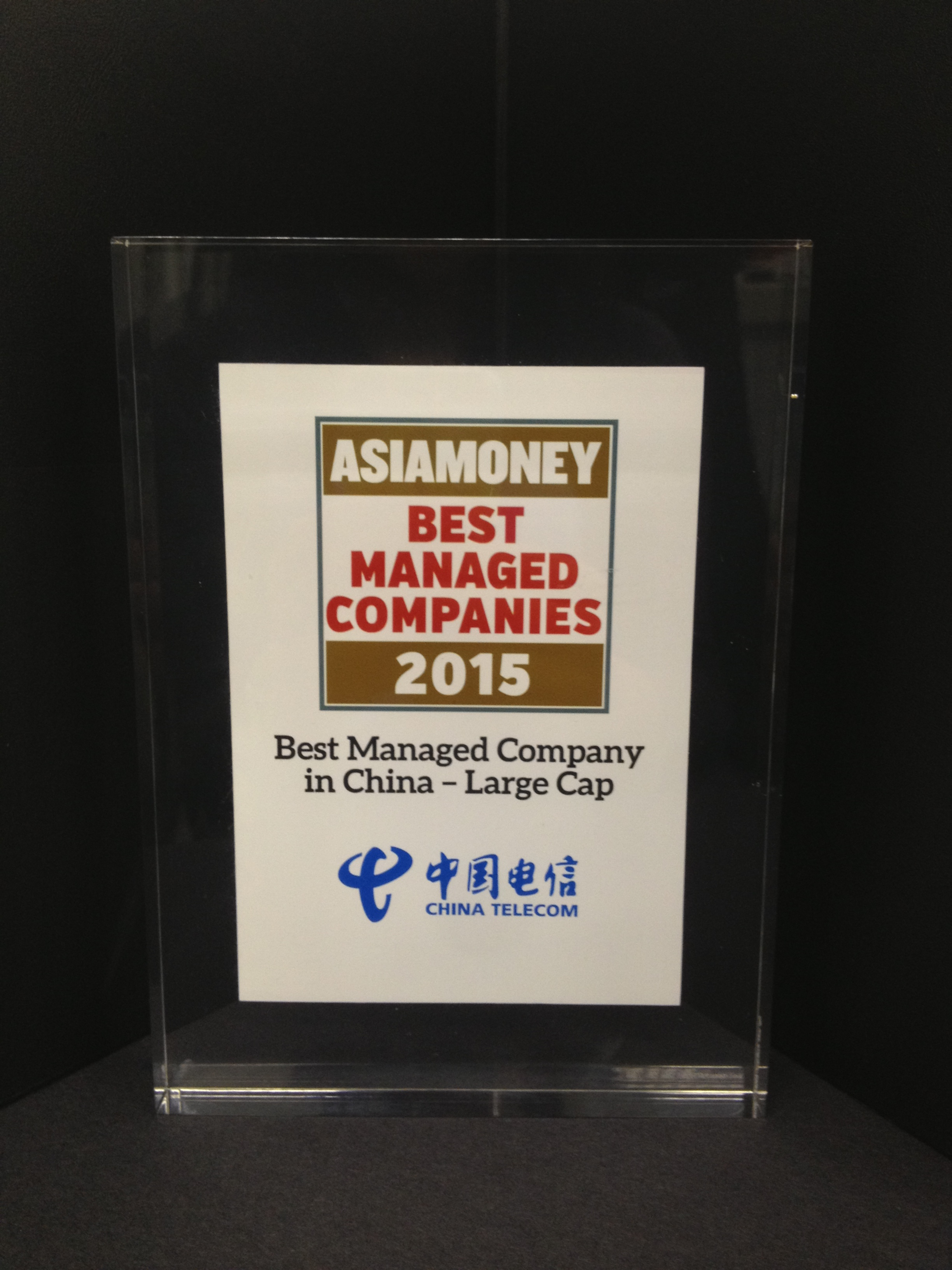 中国电信股份有限公司在《Asiamoney》2015年度最佳管理公司评选中,获分析师及投资者投票评选为「中国最佳管理大型企业」。