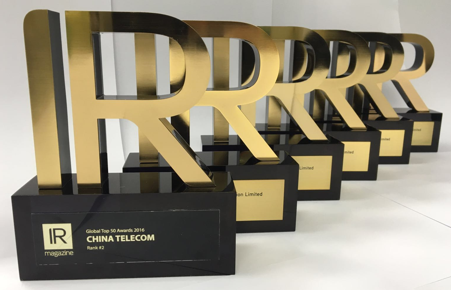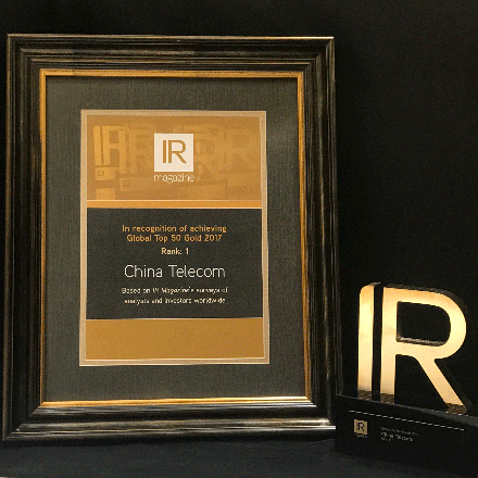 中国电信股份有限公司在《投资者关系杂志》(IR Magazine)「2016年全球50强企业」中名列「第二位」。「全球50强企业排名」是综合投资者及分析师在《投资者关系杂志》于美国、加拿大、巴西、欧洲、大中华区及东南亚地区的年度奖项评选结果而得出。