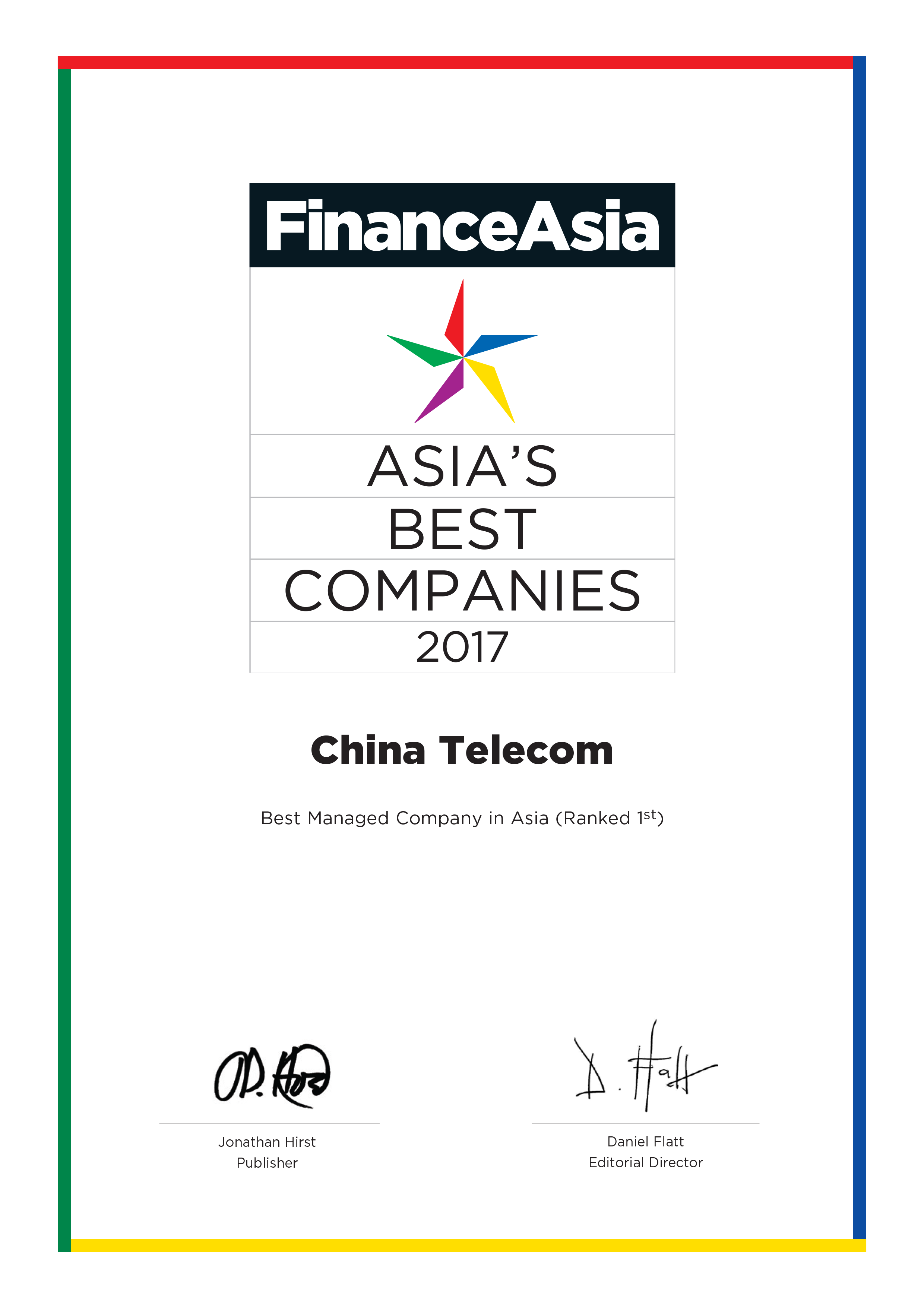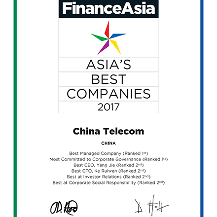 中国电信股份有限公司在《金融亚洲》(FinanceAsia)举办的「2017年度亚洲最佳管理公司评选」中,荣获来自全球多个不同地区的基金经理及分析师评选为「亚洲最佳管理公司第一名」。