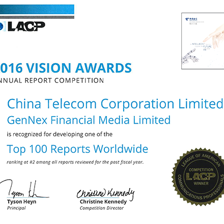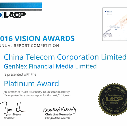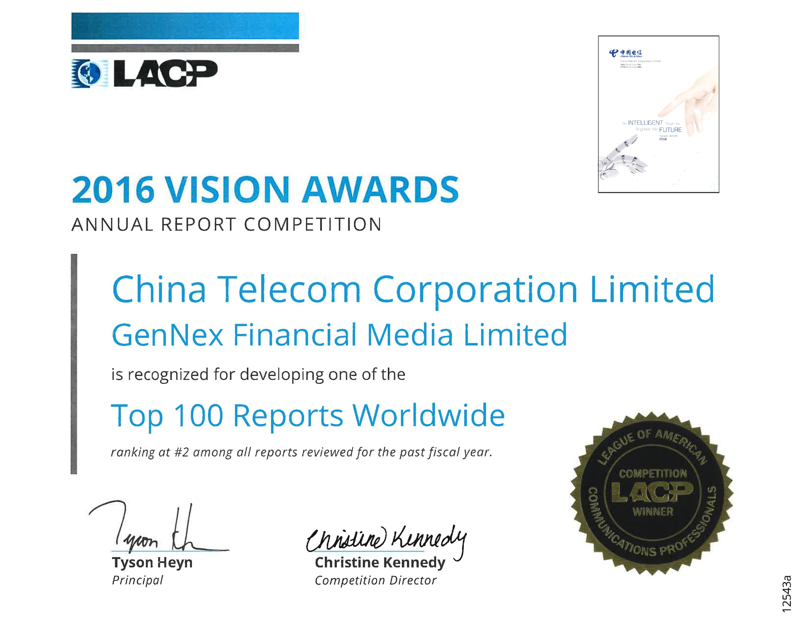 中国电信股份有限公司的二零一六年年报(「中国电信年报」)《智能牵引 创建未来》的印刷版和网上版于全球多项比赛中夺得九项顶尖大奖:
