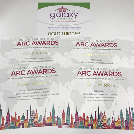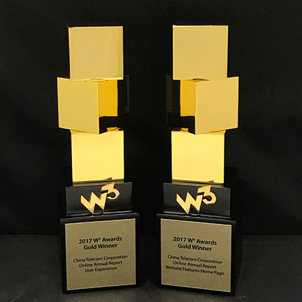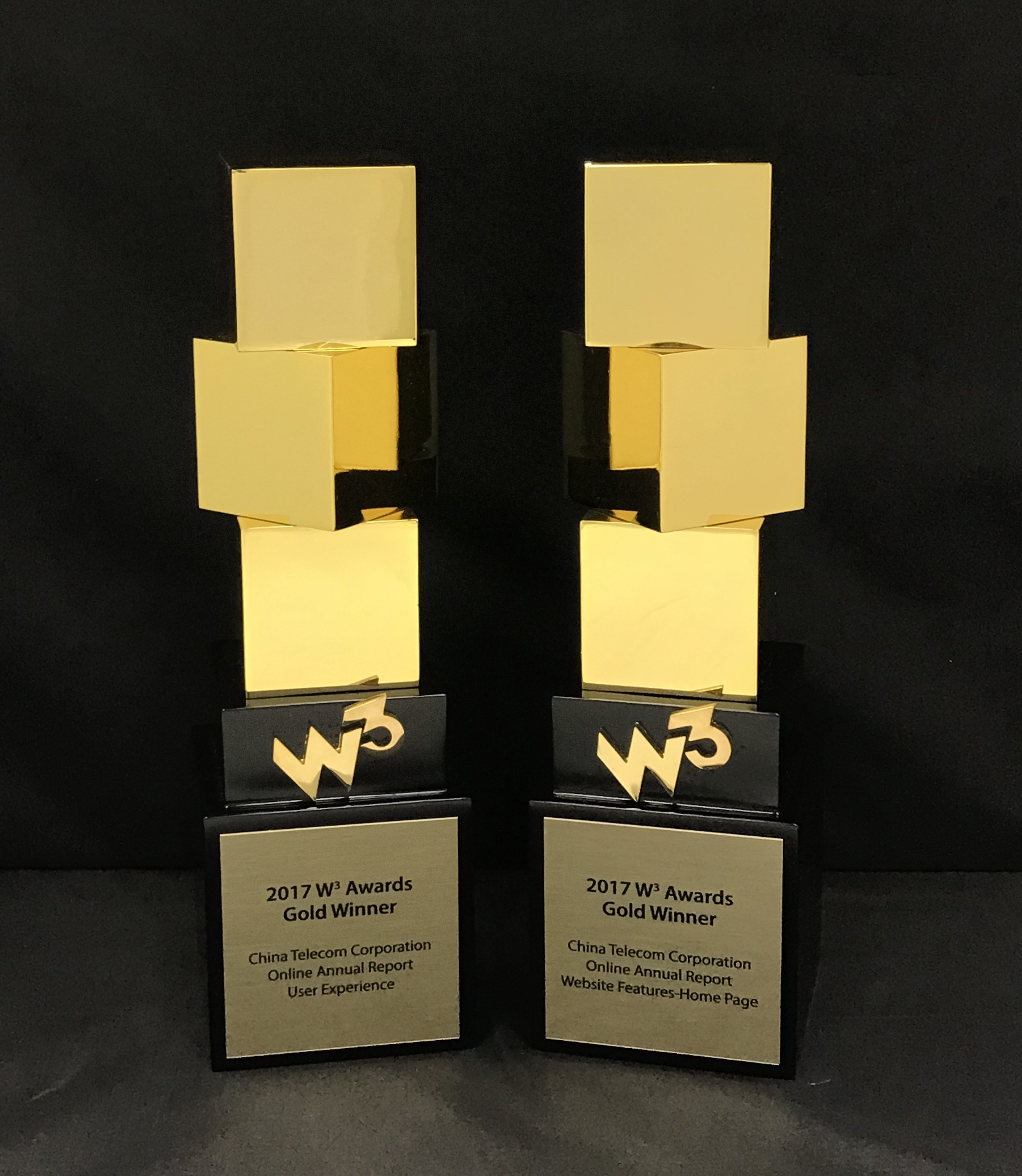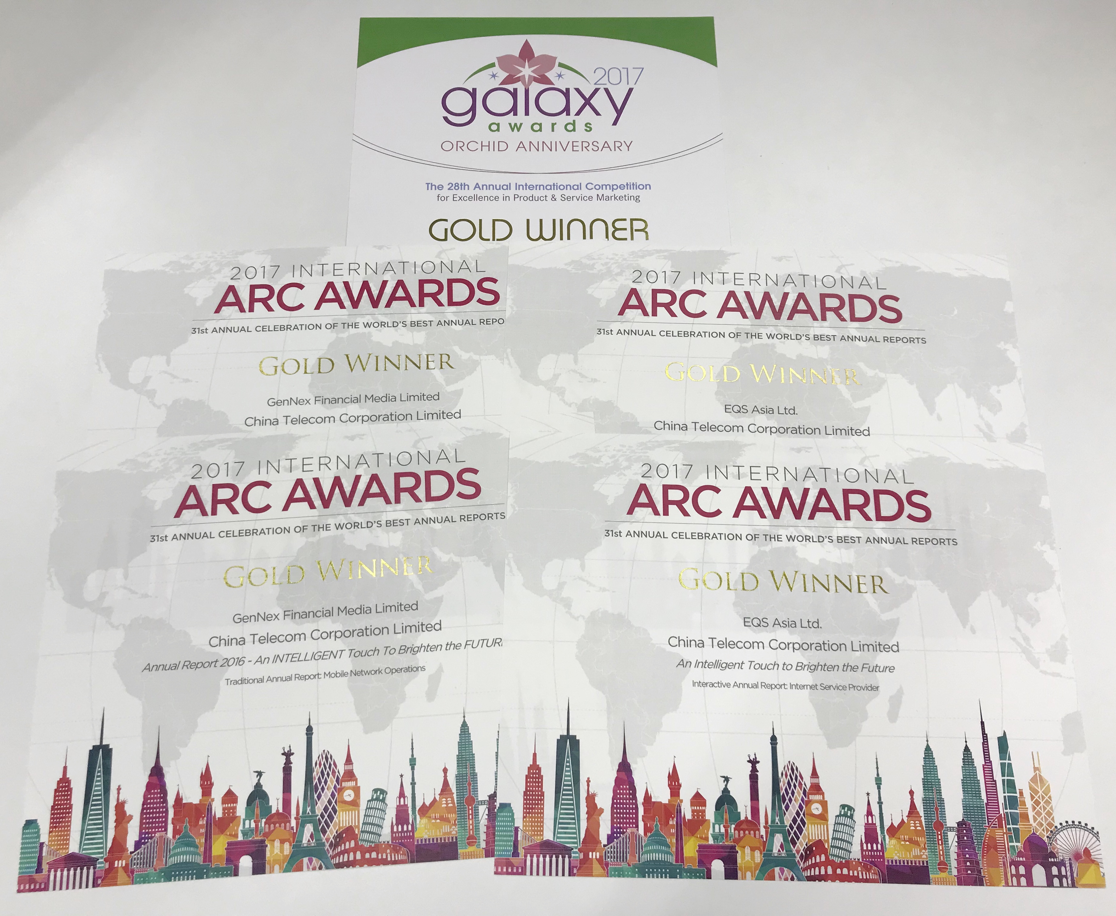 美国传媒专业联盟(LACP)举办的「LACP 2016 Vision大奖」收到来自全球近24个国家的1,000份参选作品,而中国电信年报于总分100分中得到99分。「2017年度国际ARC大奖」为全球最大型及最具独立代表性、旨在嘉许优秀年报及企业传讯的选举,被财经界誉为「年报奥斯卡颁奖礼」。「2017年度Galaxy大奖」得到来自50个国家的专才参与,旨在嘉许卓越产品和服务营销方案,且为唯一一个由业界同仁担任评审的比赛。「W³大奖」嘉许筹划出色网站、视频和市场推广计划的创意和营销专才,并属首个接纳任何规模企业竞逐的网站比赛。